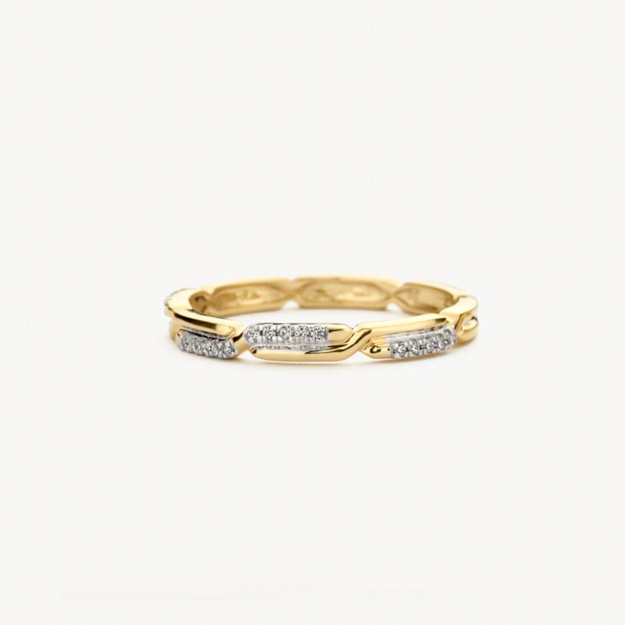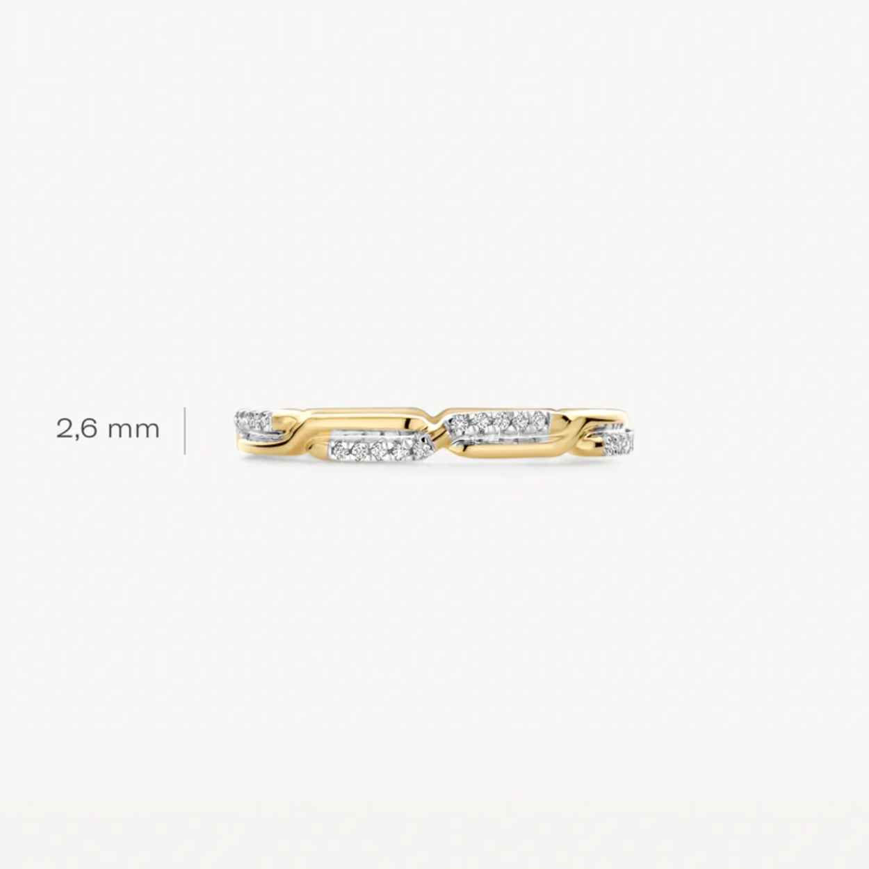 Een fantasierijk schakelontwerp van 14k geel- en witgoud bezet met schitterende zirkonia maakt van deze ring een echte eyecatcher. De doorsnede van de band is 2,8 mm. De ring is schitterend op zichzelf maar matcht ook mooi met andere (aanschuif)ringen uit onze collectie.