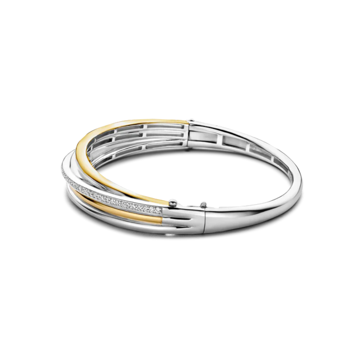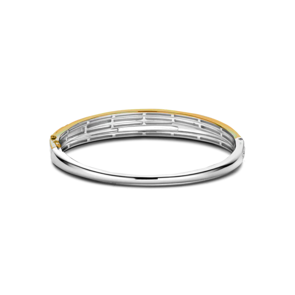 Ervaar de luxe geïnspireerd door vintage met deze TI SENTO vergulde zilveren bangle armband 23046ZY. Gemaakt van 925 sterling zilver en bedekt met platina voor een blijvende schittering, beschikt dit gedurfde statementstuk over drie slanke banden. De centrale band is bedekt met geelgoud, wat een vleugje stralende luxe aan het ontwerp toevoegt. Een vierde band, gedecoreerd met een fonkelende pave van witte cubic zirconia-stenen, kruist de andere banden en creëert een betoverende samensmelting van licht en schaduw. Geïnspireerd door de verfijnde details van architectonische structuren, is deze armband een eerbetoon aan modern design. De gedurfde maar verfijnde esthetiek en de contrasterende texturen van zilver, platina en geelgoud maken dit tot een werkelijk uitzonderlijk stuk. Versterk je dagelijkse look met dit verbluffende accessoire. Draag het alleen voor een gedurfde statement of combineer het met andere TI SENTO armbanden voor een samengestelde ensemble die vintage-geïnspireerde verfijning uitstraalt. Met zorg vervaardigd voor gevoelige huid, garandeert deze nikkelvrije en hypoallergene armband blijvend comfort en kwaliteit.