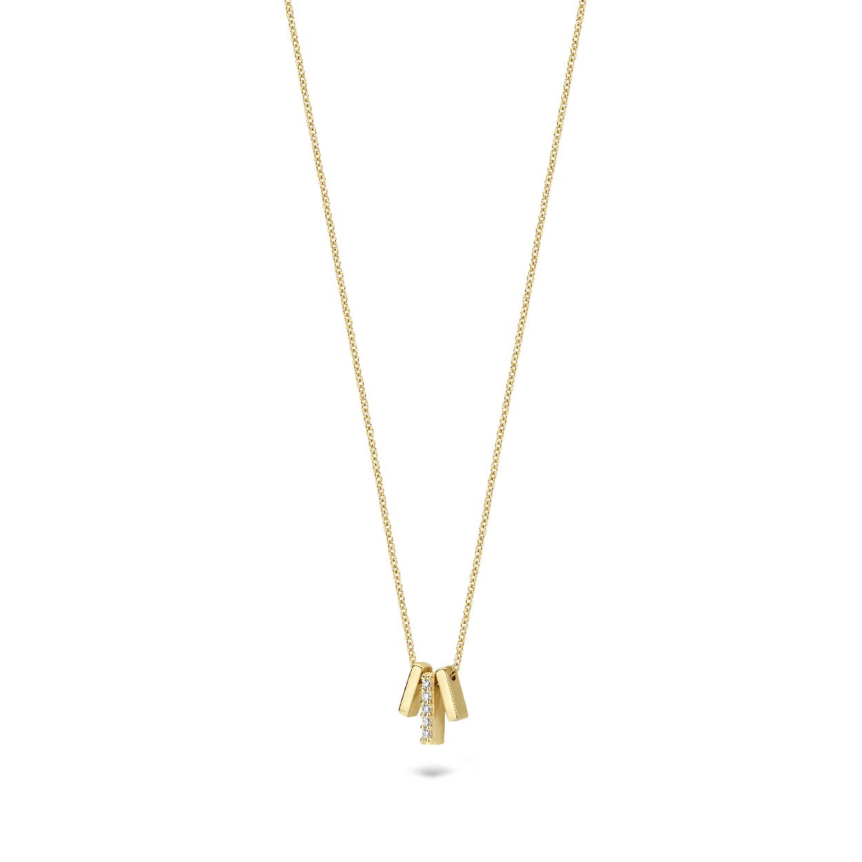 Dit bijzondere collier van 14k geelgoud bestaat uit een schakelketting en een modern vormgegeven hanger bezet met briljant geslepen zirkonia. Schitterend op zichzelf of in combinatie met andere sieraden uit onze collectie.