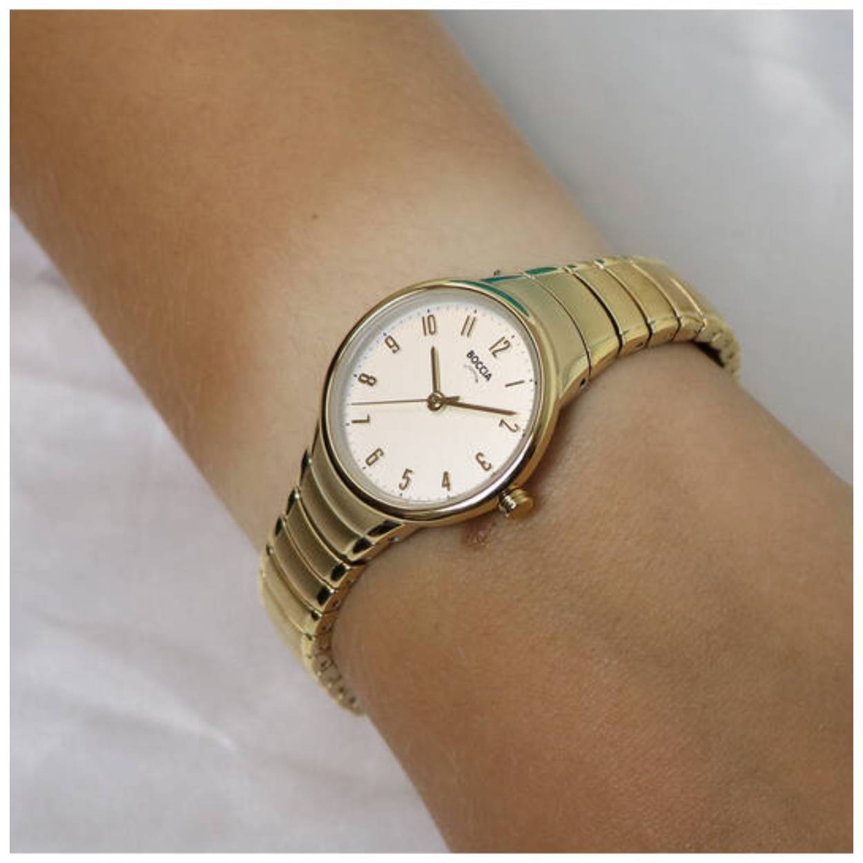 Een tijdloos en elegant goudkleurig horloge van het merk Boccia Titanium. Het horloge beschikt over een witte wijzerplaat met ronde titanium horlogekast van 28mm.