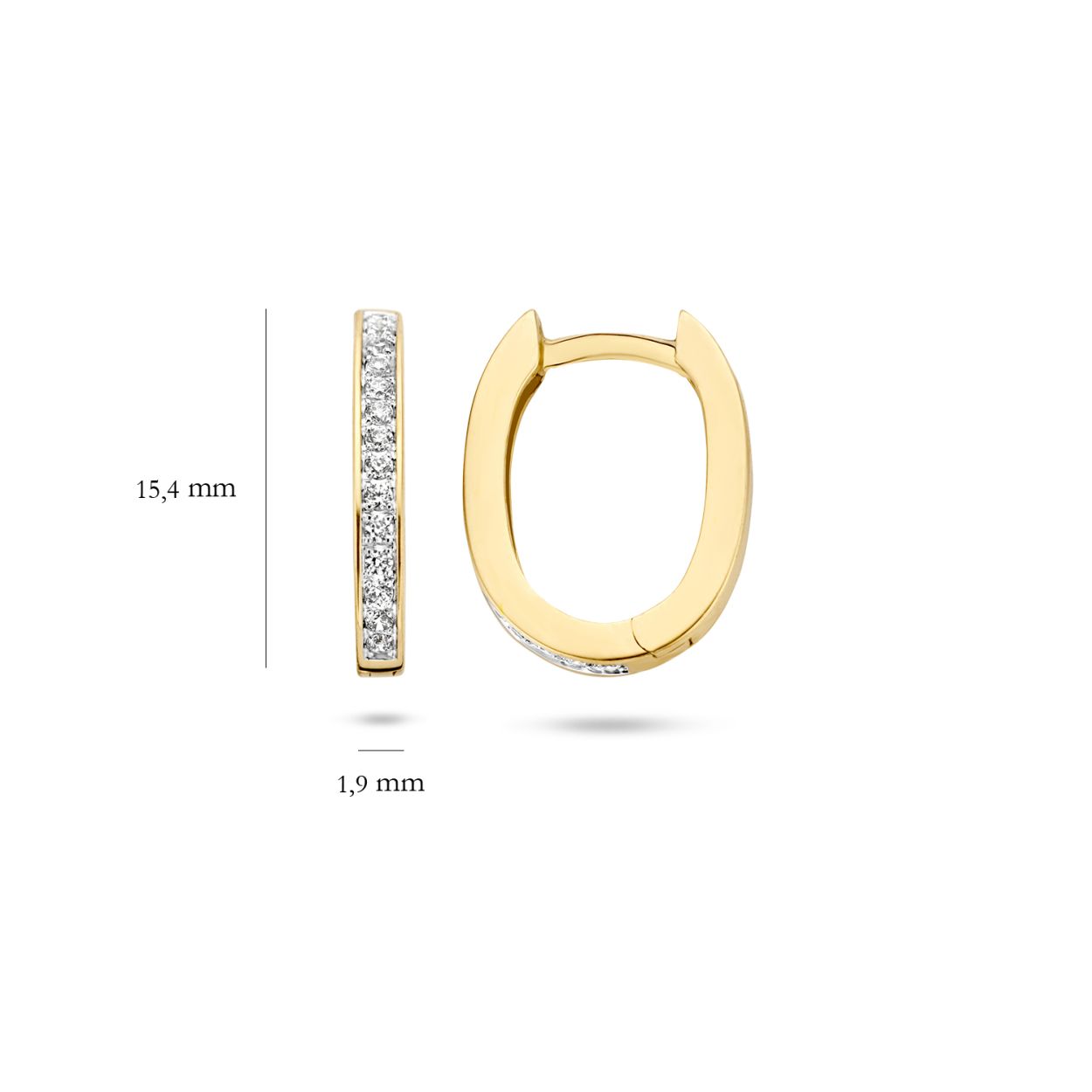 Deze elegante oorringen met witte zirkonia hebben een ovalen vorm. Ze zijn gemaakt van 14k geelgoud en hebben een dikte van 1,9 mm en een hoogte van 15,4 mm. Prachtig op zichzelf, maar ook heel mooi in combinatie met oorbedels en andere (oor)sieraden uit onze collectie.