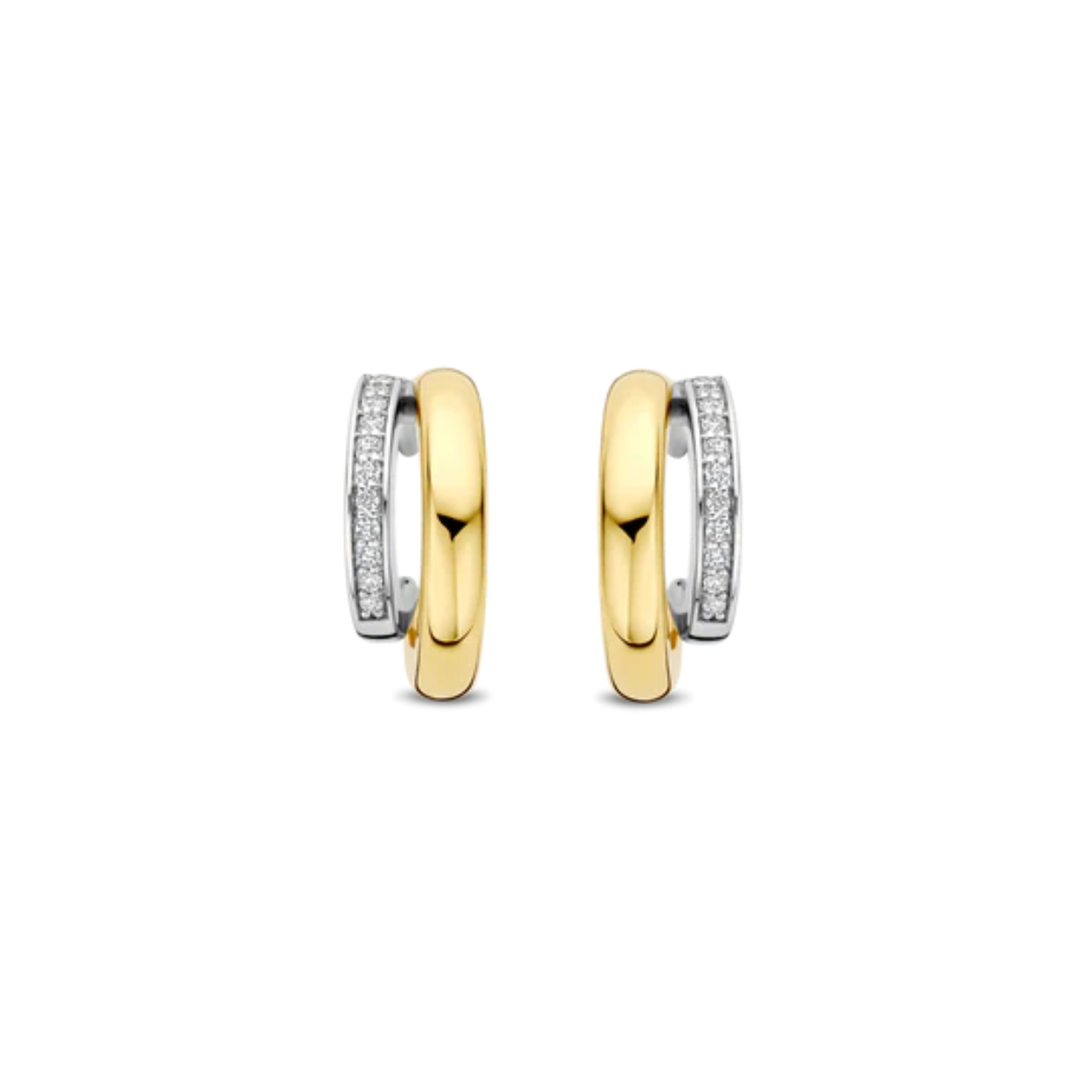 Omarm sculpturaal contrast met deze TI SENTO goudkleurig vergulde zilveren oorbellen 78035ZY. Vervaardigd uit 925 sterling zilver, vormt elke oorbel een gedurfde, asymmetrische ring bestaande uit twee in elkaar grijpende bogen: één strak en goudkleurig verguld, de ander platinakleurig verguld en pavé-gezet met briljant geslepen witte cubic zirconia. De vloeiende compositie creëert een subtiel samenspel van licht, kleur en textuur—perfect om zowel minimalistische outfits als avondlooks te verrijken. Compact maar opvallend, bieden ze een verfijnde twist aan klassieke hoops. Nikkelvrij en hypoallergeen, ze garanderen moeiteloze elegantie en draagcomfort voor de gevoelige oren gedurende de hele dag.