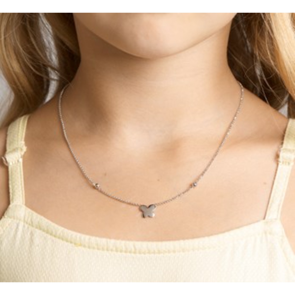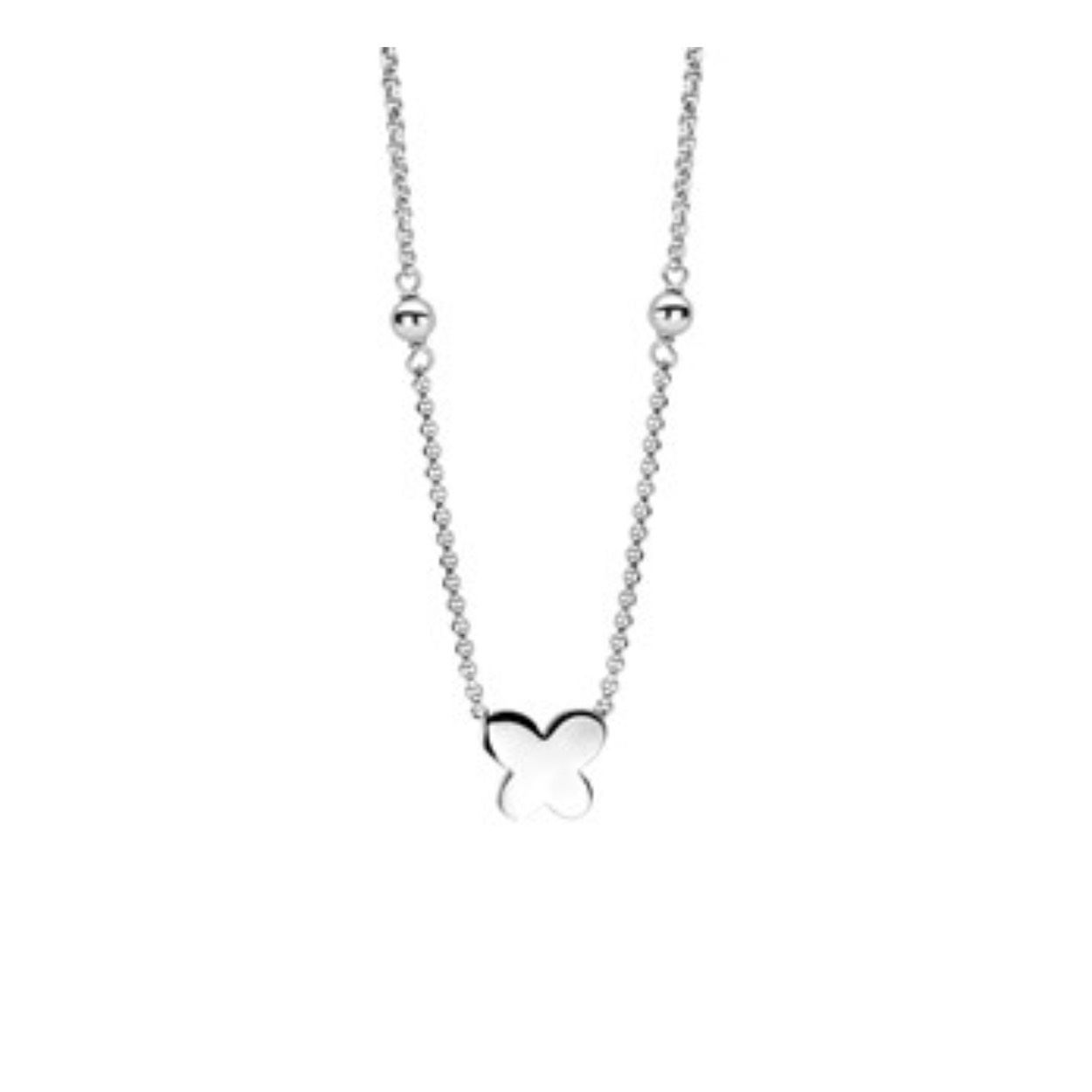 Schattig fijn gerhodineerd 925 zilveren jasseron collier uitgevoerd met een vlinder van 8.5x9mm, poli afgewerkte bolletjes van 3mm en een karabijn sluiting. Het collier heeft een draaglengte van 36cm en een extensie van 3cm. Het collier is onderdeel van een set er is ook een bijpassend armband verkrijgbaar.
