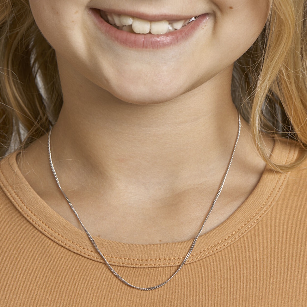 Gerhodineerd zilveren collier met gourmette schakel en een draaglengte van 36cm en een extensie van 4cm. Uitgevoerd met een karabijn sluiting.