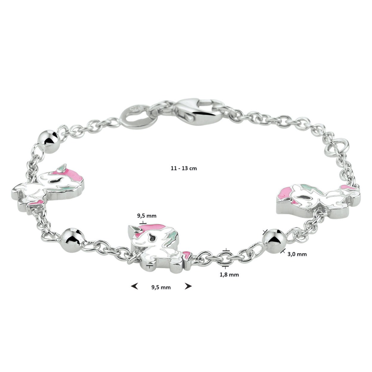 Gerhodineerd 925 zilveren armband uitgevoerd met anker schakel en eenhoorns. De armband heeft draaglengtes van 11 tot 13cm en een stevige karabijn sluiting. De eenhoorns hebben een afmeting van 9.5x9.5mm. De schakelbreedte is 1.8mm.