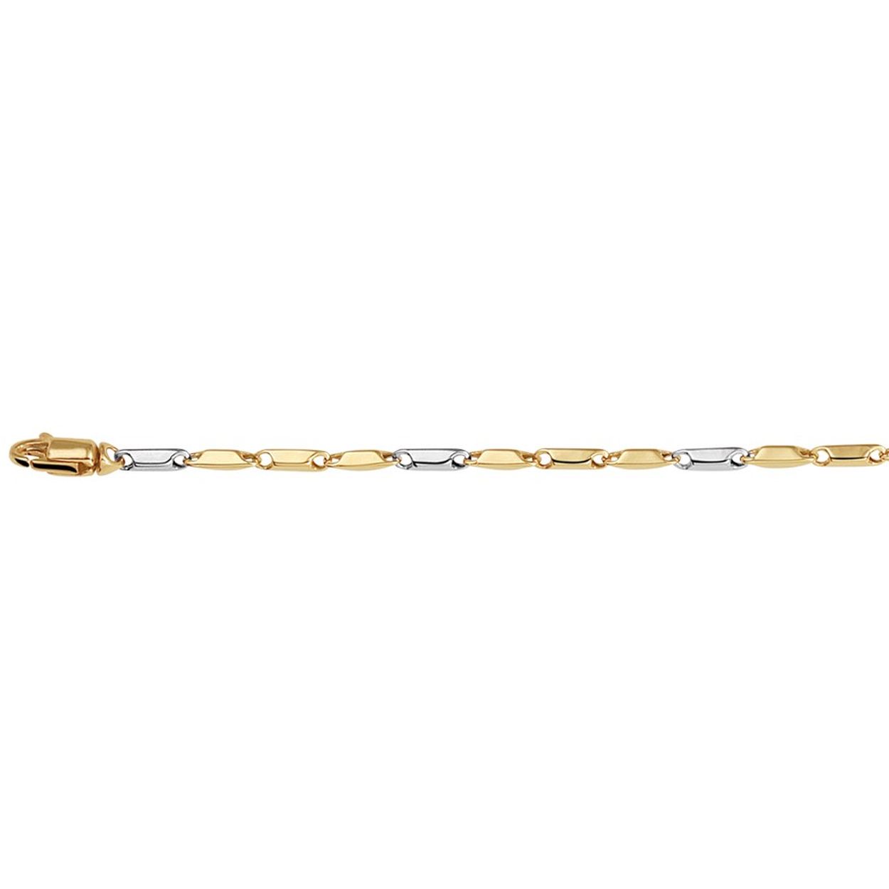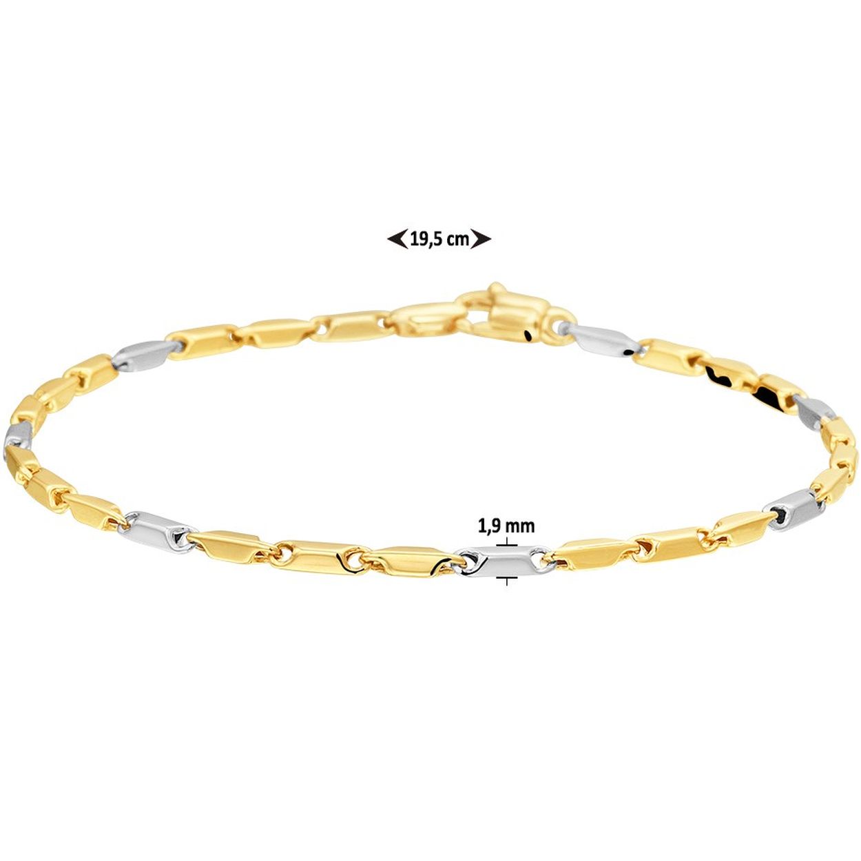 Bicolor wit- en geelgouden armband met een lengte van 18cm en breedte van 1.9mm. De armband is te combineren met een bijpassend collier uit onze collectie.