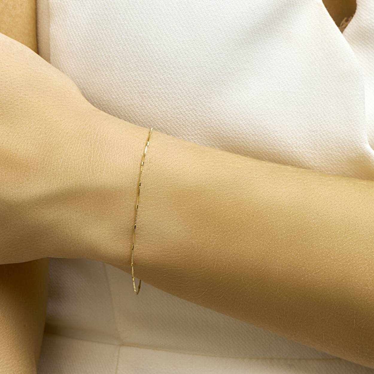 Geelgouden 0.9mm venetiaanse armband uitgevoerd met staafjes en stevige veerring sluiting. De armband is te combineren met bijpassend collier uit onze collectie.