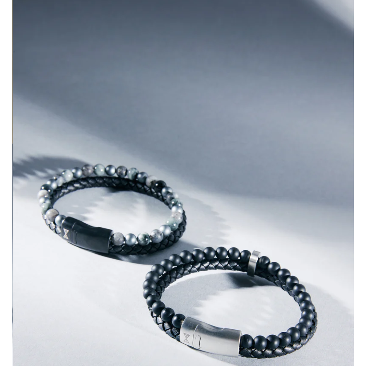 This bracelet is a combination of leather and matte Obsidian stones. The strong elastic cord keeps this bracelet together and ensures a comfortable fit. Both bracelets are connected with a stainless steel clasp and stays securely on your wrist thanks to the magnetic clasp.Combi String Black Elk Peak (19,5cm)