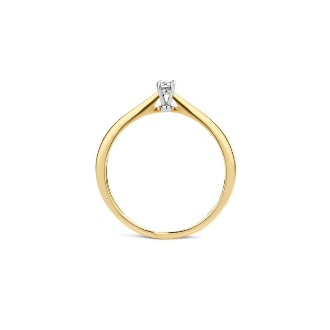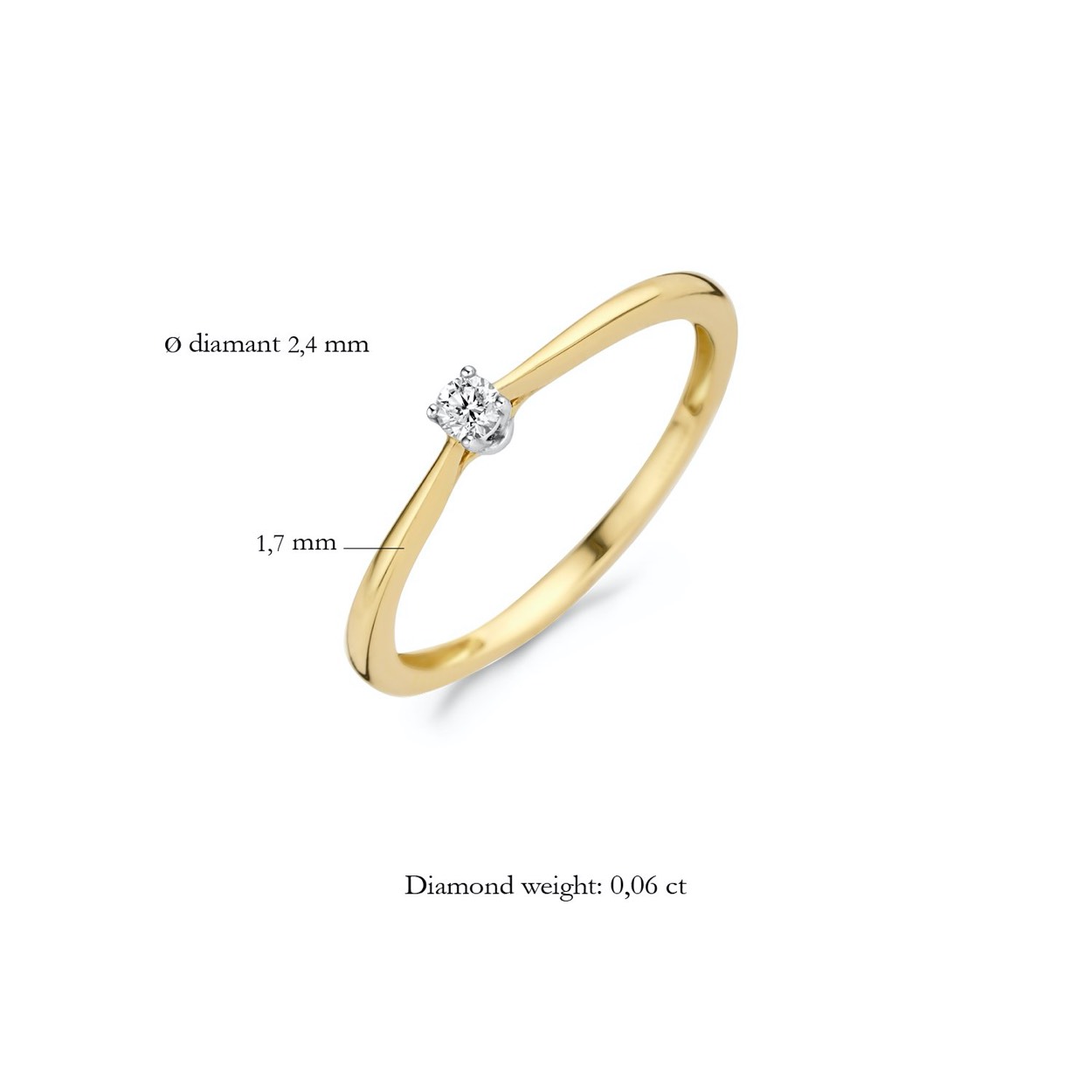 Een sprankelende, briljant geslepen diamant in chatonzetting siert deze tijdloze ring van 14k geel en -witgoud. De band heeft een doorsnee van 1,7 mm en de diamant heeft een karaatgewicht van 0,06. Prachtig als solitair of in combinatie met andere ringen uit onze collectie.