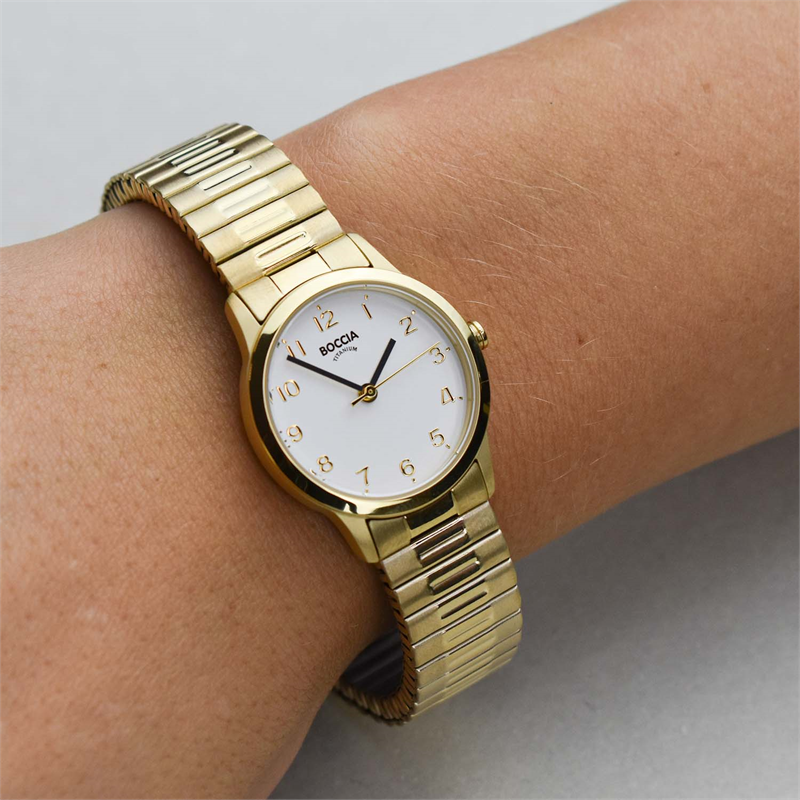 Dit dameshorloge van Boccia Titanium heeft een nette uitstraling. De goudkleurige titanium horlogekast zorgt voor een stijlvolle look en de witte wijzerplaat maakt het horloge klassiek. Het horloge heeft een ronde kast met een diameter van 26mm, een mineraalglas, en is 5ATM. Combineer dit prachtige exemplaar met de andere sieraden van Boccia Titanium voor een complete look. Aan de titanium kast zit een goudkleurige schakel band.