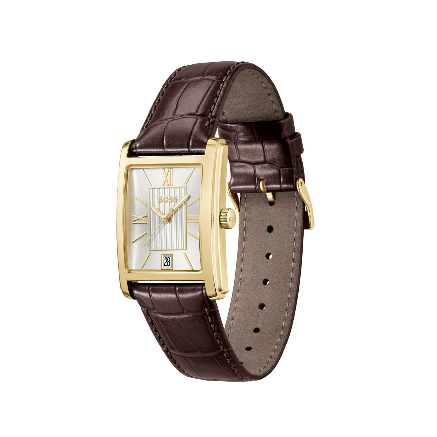 garderobe aanvult en dient als een betrouwbaar en stijlvol accessoire voor elke gelegenheid. Met zijn gedurfde maar verfijnde ontwerp blijft de PRINCIPLE DRESS de weg wijzen, het eerdere succes eren en tegelijkertijd de toekomst herdefiniëren in eigentijdse stijl. Dit herenhorloge valt op door zijn stalen rechthoekige goudkleurige gebogen horlogekast met zijn fijn bewerkte zilverwitte wijzerplaat met een datum en deels romeinse uursaanduiding. Aan de kast zit een bruine lerenband met een gespsluiting. Het horloge heeft een afmeting van 28x39mm met een mineraalglas en is 3ATM.