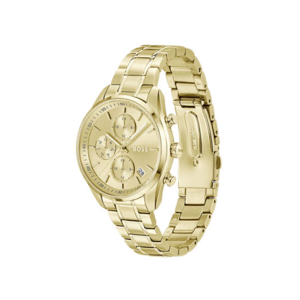 Dit BOSS horloge uit de GRAND TOUR LADIES serie met artikelnr: HB1502768 heeft een luxe sportieve uitstraling. Zeer geschikt voor de moderne stijlvolle vrouw van nu. Het dameshorloge valt op door zijn stalen goudkleurige horlogekast met een gladde goudkleurige bezel en een goudkleurige sunray wijzerplaat met een dag, datum en 24-uursaanduiding. Opvallend zijn de fijne wijzers. Aan de kast zit een stalen mat glanzende goudkleurige schakelband met een vouwsluiting. Het horloge heeft een doorsnee van 38mm met een mineraalglas en is 3ATM.