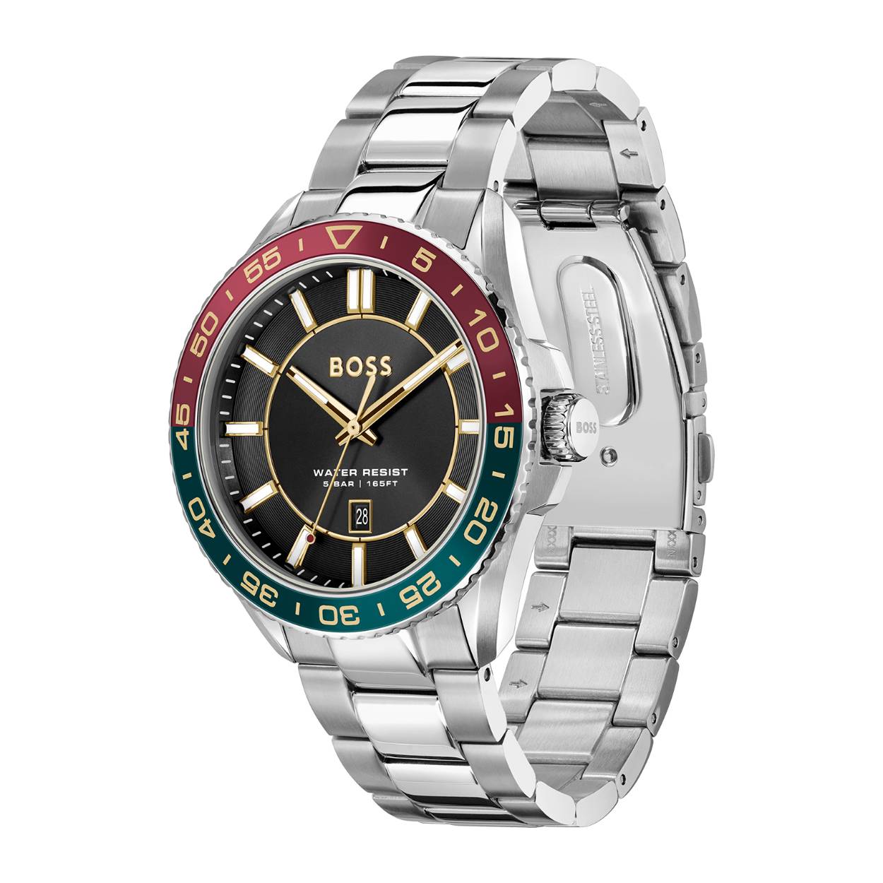 Dit BOSS horloge uit de RUNNER 3H serie met artikelnr: HB1514210 heeft een stoere sportieve uitstraling. Zeer geschikt voor de moderne stijlvolle man van nu. Het herenhorloge valt op door zijn stalen horlogekast met een gekleurde bedrukte bezel en een zwarte sunray wijzerplaat met een datum. Opvallend zijn de wijzers en uurstrepen die met lumibrite zijn ingelegd. Aan de kast zit een stalen mat glanzende schakelband met een vouwsluiting. Het horloge heeft een doorsnee van 43mm met een mineraalglas en is 5ATM.