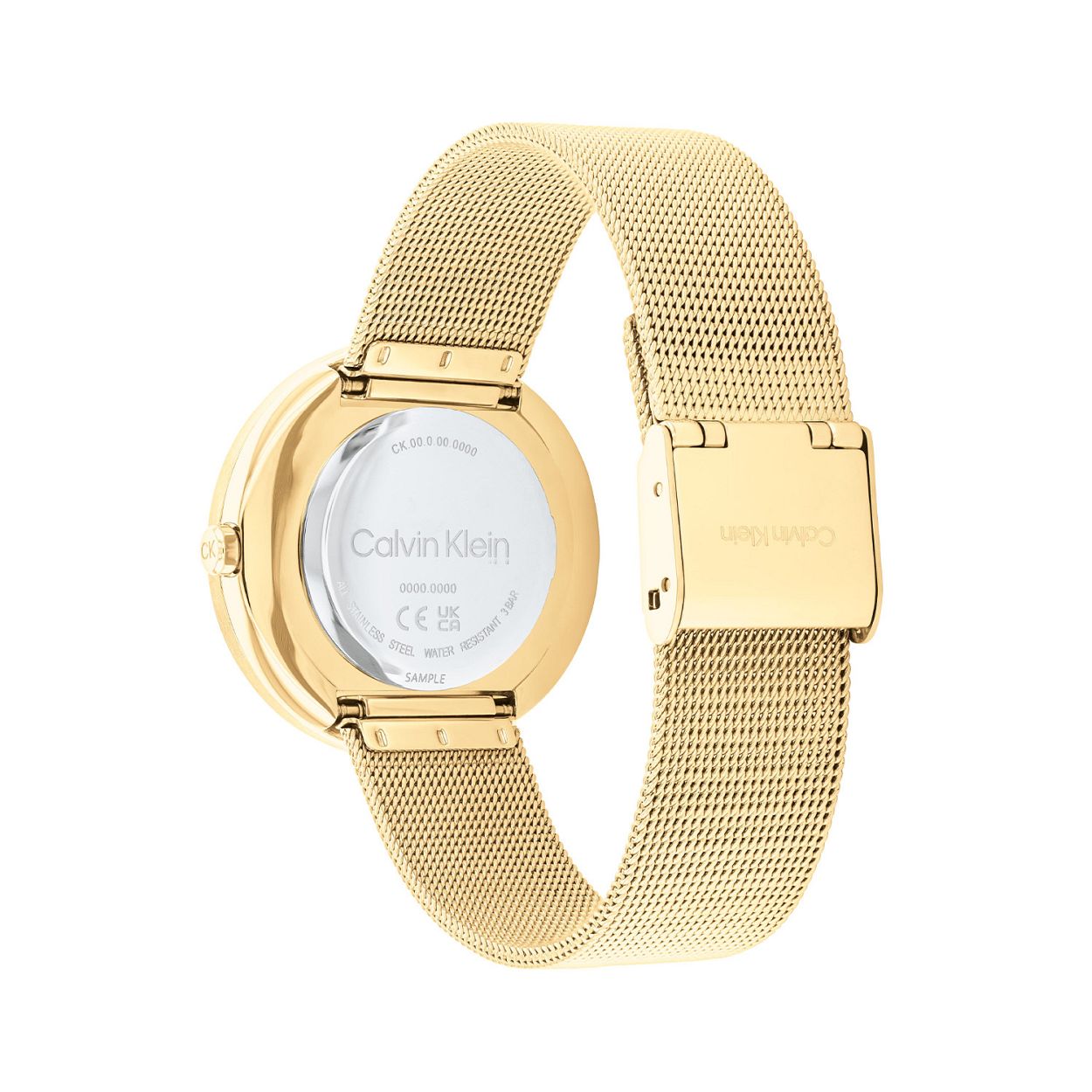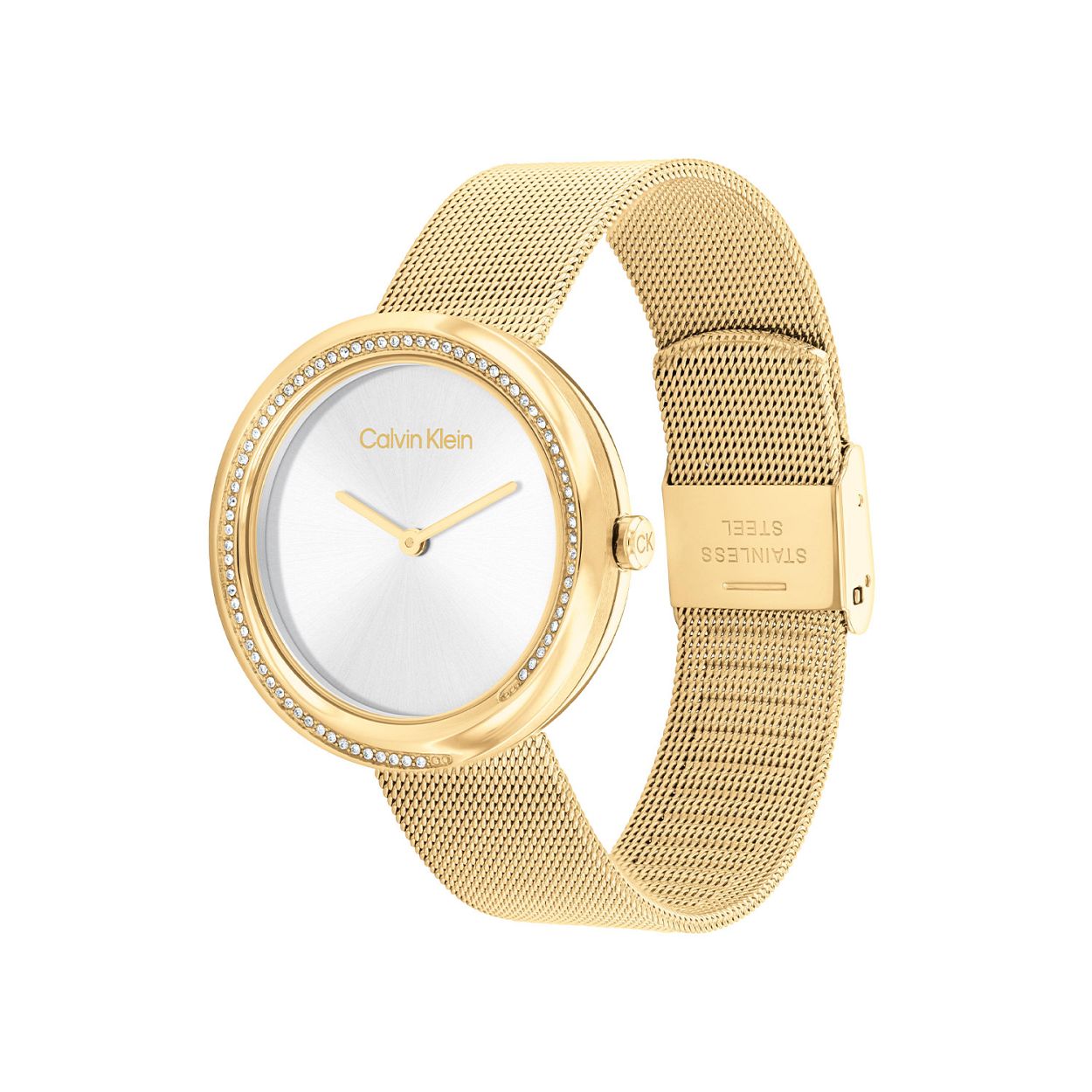 Dit Calvin Klein dameshorloge met nr CK25200150 is een chique en minimalistisch ontwerp. De stijlvolle ronde gladde goudkleurige stalen kast heeft een zilverwitte  sunray wijzerplaat en een bezel vol gezet met kristallen. Op de wijzerplaat is alleen de merknaam gedrukt en de tijd wordt aangegeven met de hele fijne wijzers. Aan de goudkleurige kast zit een goudkleurige milanese band. Het sierlijke horloge heeft een mineraalglas, een doorsnee van 34mm en is 3 ATM.