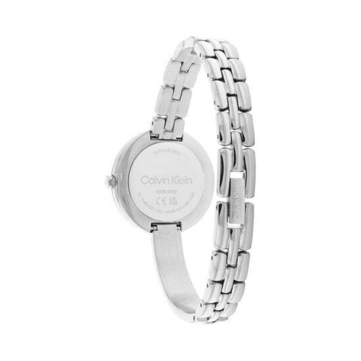 Dit Calvin Klein dameshorloge met nr CK25200278 is een chique ontwerp. De ronde zilverkleurige stalen kast heeft een gladde zilverkleurige bezel. Op de zilverwitte brushed wijzerplaat is de merknaam gedrukt en de tijd wordt aangegeven met hele fijne wijzers. Aan de stalen kast zit een zilverkleurige half bangle, half geschakelde band. Het sierlijke horloge heeft een mineraalglas, een doorsnee van 28mm en is 3 ATM.