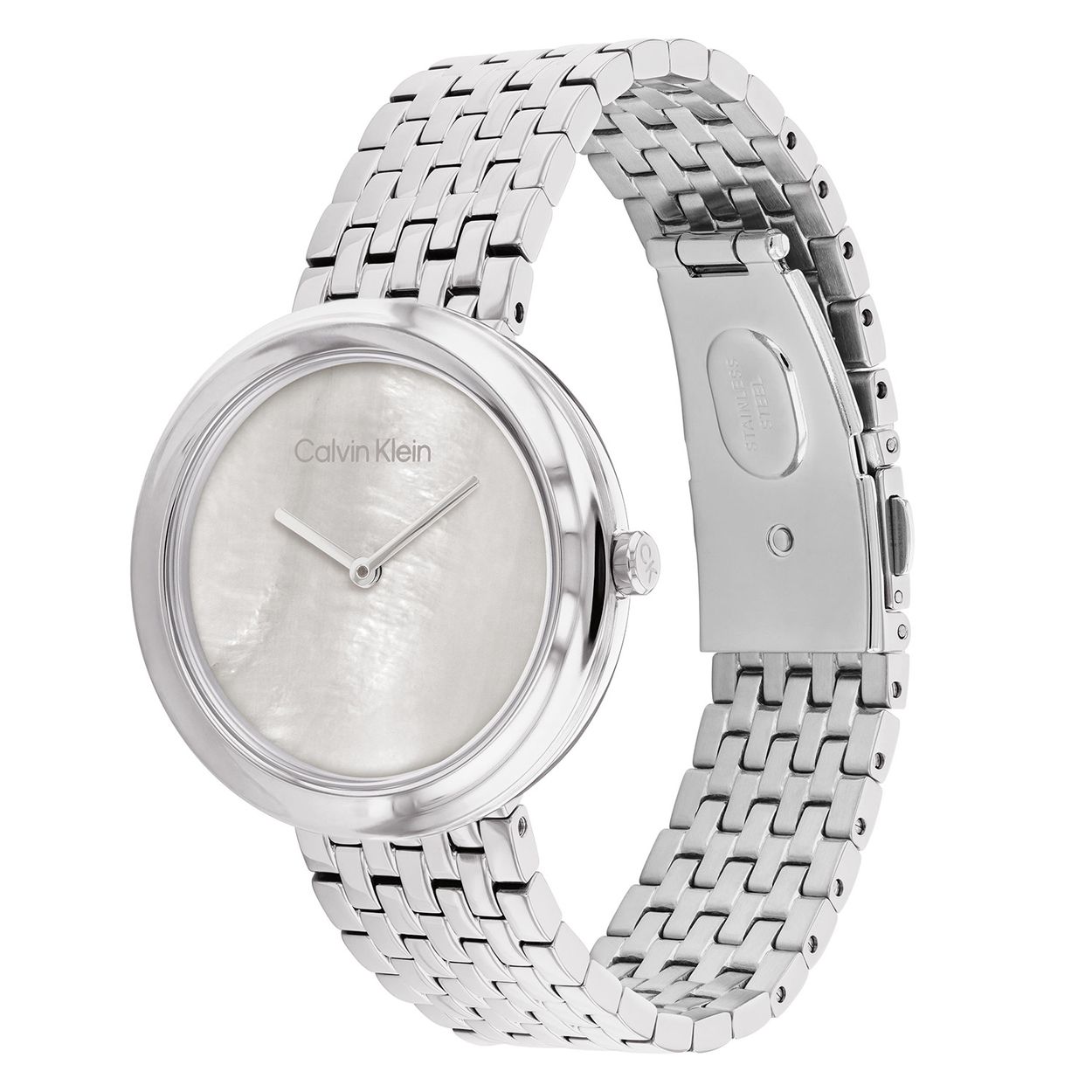 Dit Calvin Klein dameshorloge met nr CK25200320 is een tijdloos en chique ontwerp. De stijlvolle zilverkleurige ronde gladde stalen kast heeft een grijze parelmoer wijzerplaat met een bezel met een twist. Op de wijzerplaat zijn alleen de zilverkleurige wijzers zichtbaar en is de naam Calvin Klein afgedrukt. Aan de zilverkleurige kast zit een zilverkleurige glimmende fijne schakelband. Het sierlijke horloge heeft een mineraalglas, een doorsnee van 34mm en is 3 ATM.