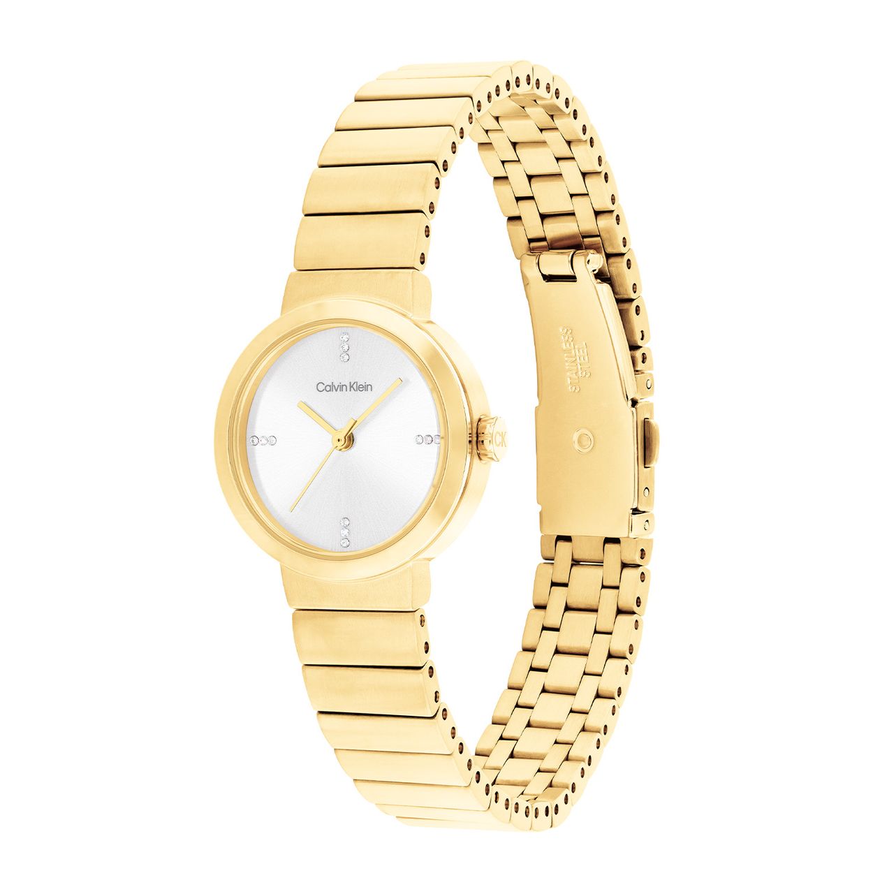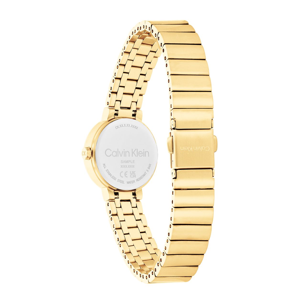 Dit Calvin Klein dameshorloge met nr CK25200416 is een tijdloos ontwerp. De fijne ronde goudkleurige stalen kast heeft een gladde bezel. Op de zilverkleurige matte sunray wijzerplaat is de tijdsaanduiding op een minimalistische manier verwerkt. De goudkleurige schakelband is op een strakke wijze aangezet. Het sierlijke horloge heeft een mineraalglas, een doorsnee van 25mm en is 3 ATM.