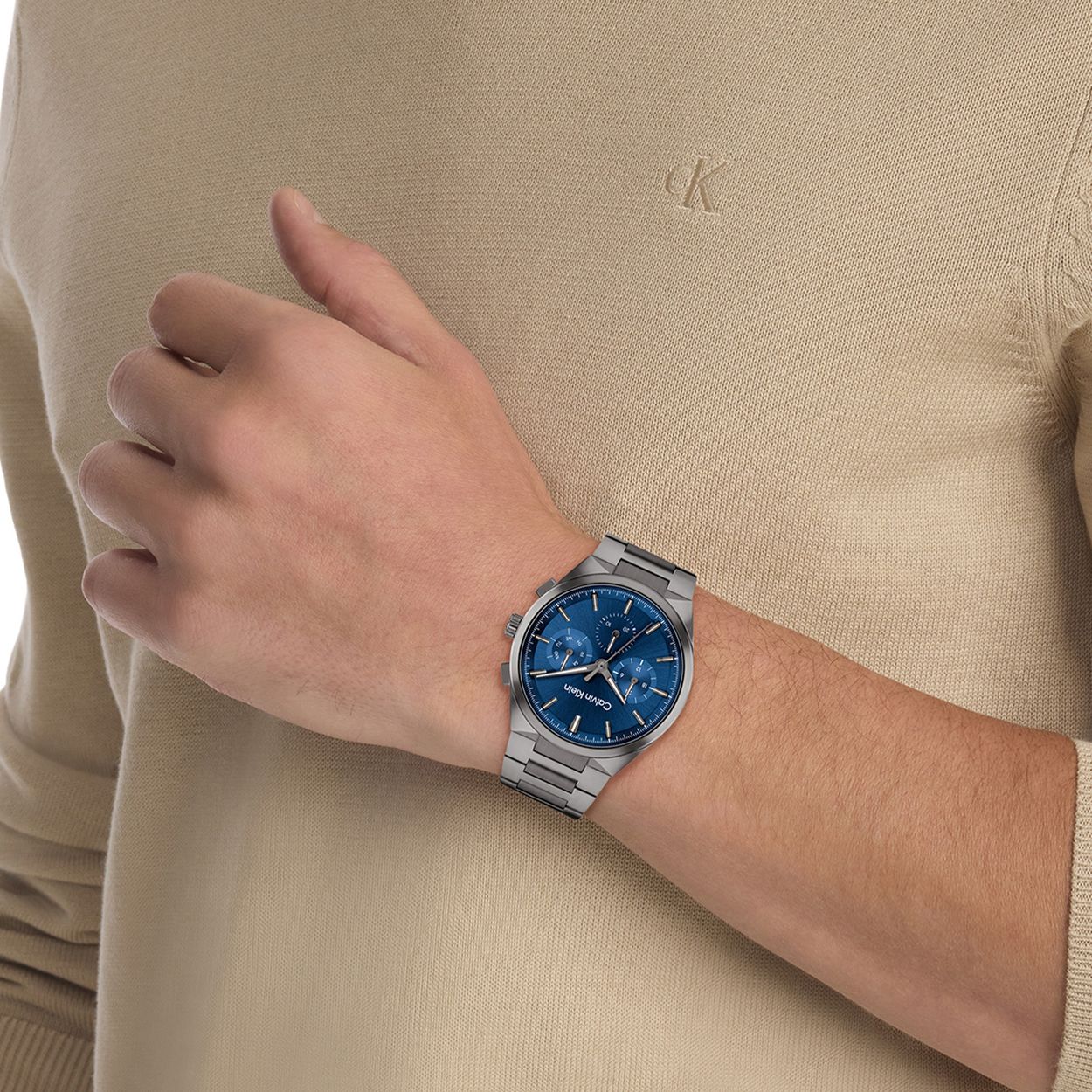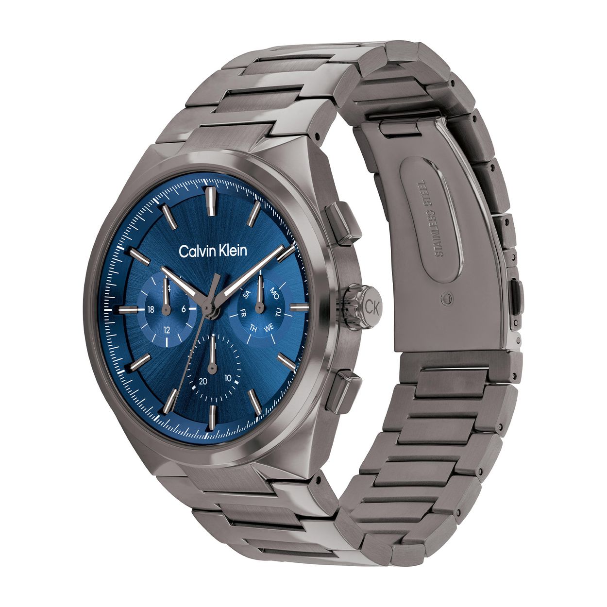 Dit Calvin Klein herenhorloge met nr CK25200443 is een chique en sportief ontwerp. De stijlvolle ronde stalen grijze kast heeft een gladde bezel met een blauwe wijzerplaat met dag, datum en 24-uursaanduiding. Aan het horloge zit een grijze stalen schakelband met vouwsluiting. Het horloge heeft een mineraalglas, een doorsnee van 44mm en is 3ATM.