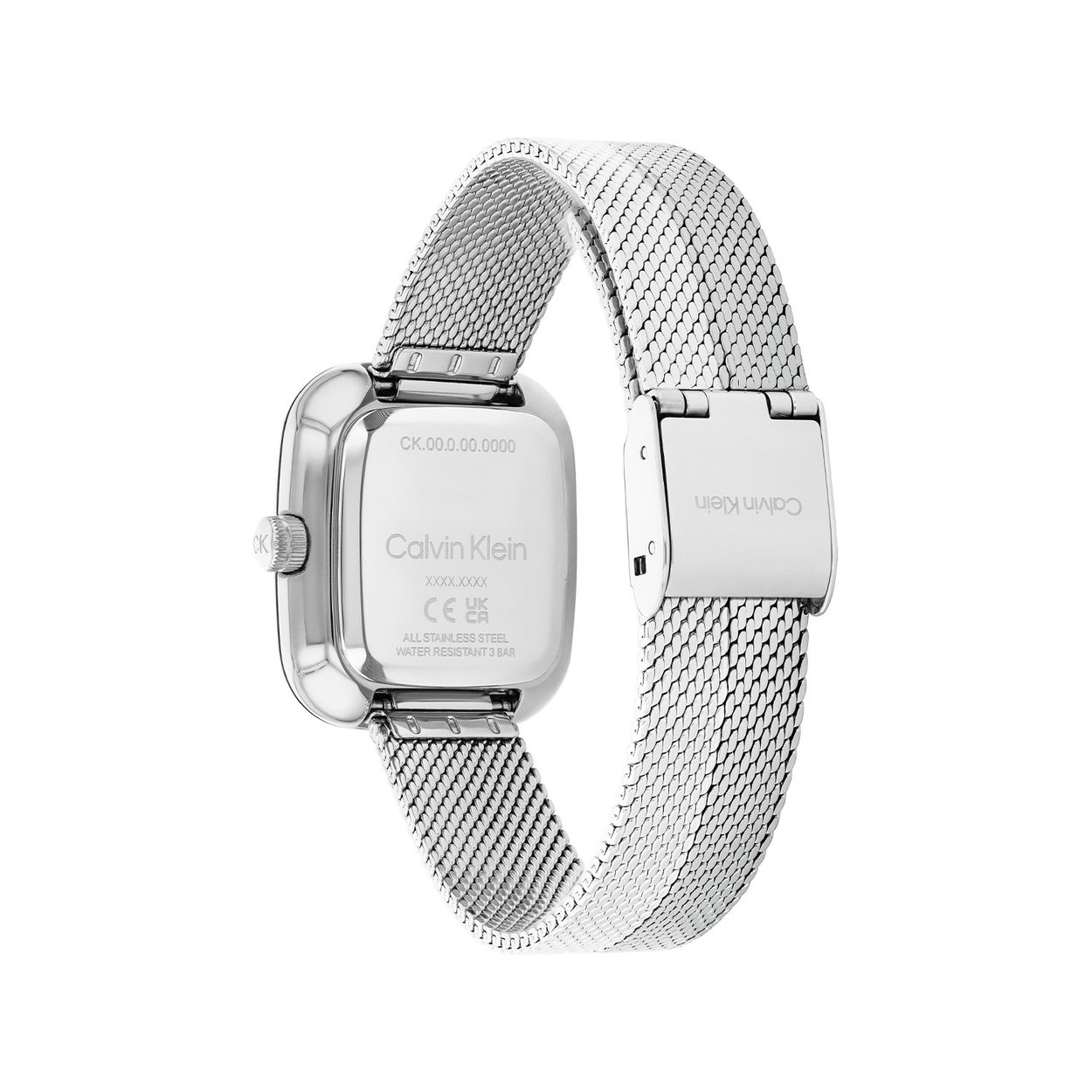 Dit Calvin Klein dameshorloge met nr CK25100098 is een klassiek ontwerp. De stijlvolle rechte stalen kast heeft een gladde bezel en een zilverkleurige sunray wijzerplaat met fijne wijzers. Strak aan de kast zit een stalen fijne gevlochten band met een drukluiting. Het elegante dameshorloge heeft een mineraalglas, een doorsnee van 30mm en is 3ATM.