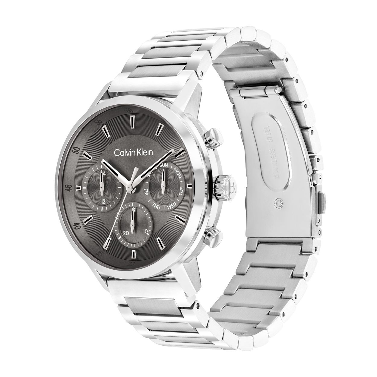 Dit Calvin Klein herenhorloge met nr CK25200493 is een stijlvol ontwerp. De ronde stalen kast heeft een glimmende bezel en een grijze geborstelde sunray wijzerplaat met een dag, datum en 24-uursaanduiding. Aan de kast zit een stalen schakelband met een vouwsluiting. Het stoere herenhorloge heeft een mineraalglas, een doorsnee van 41mm en is 3ATM.