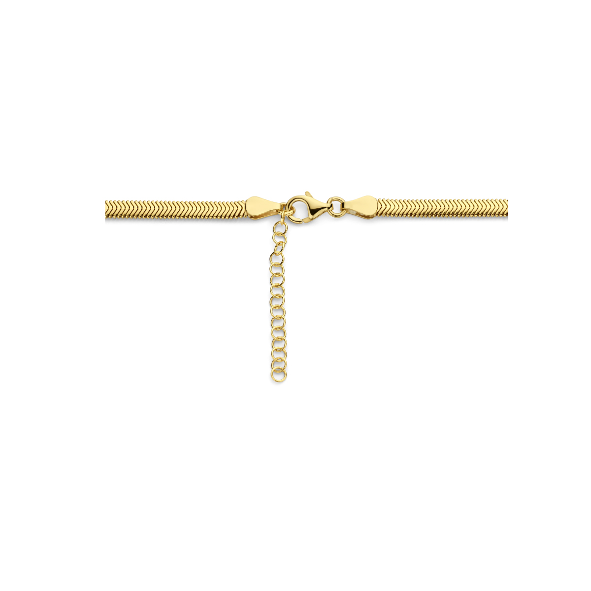 Geelgoud op 925 zilveren omega collier uitgevoerd met een karabijn sluiting. Het collier heeft een draaglengte van 40cm en een extensie van 4cm.