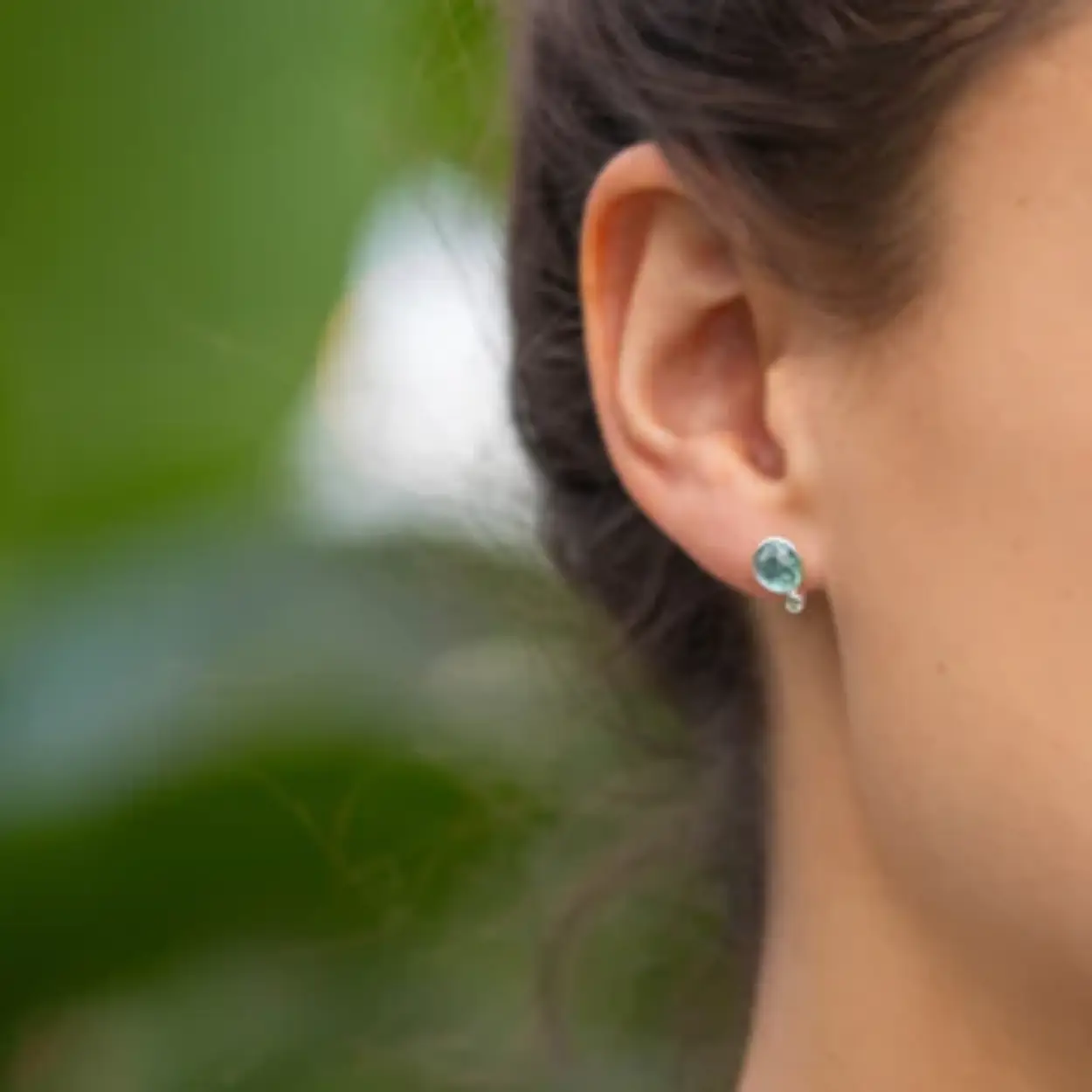 Deze sterling zilveren oorknoppen bevatten elk een 7 x 6 mm roosgeslepen niervormige blauwe kwarts met een 2 mm gefacetteerde peridoot. De oorknoppen hebben een doorsnede van +/- 1 cm.