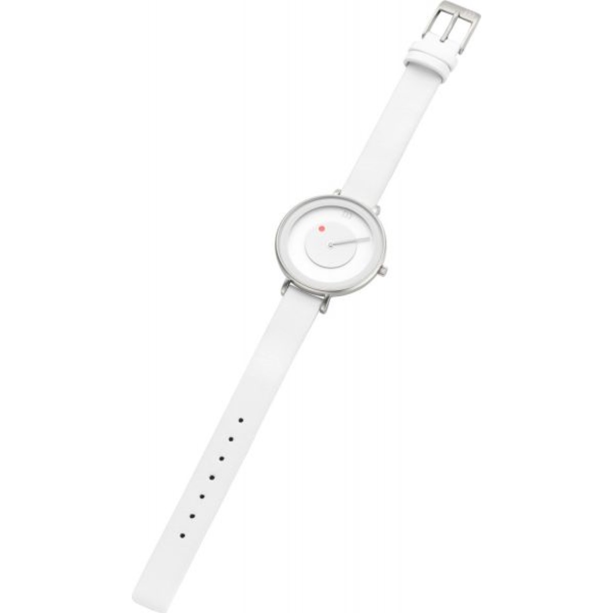 Danish Design horloge Måne, edelstaal. De maanvormige urenindicator draait rond de wijzerplaat zoals de maan om de aarde draait. Met wit lederen horlogeband.