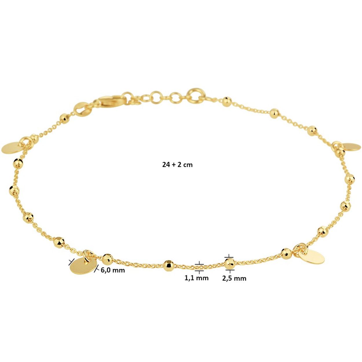 Zilveren , geel verguld enkelbandje uitgevoerd met rondjes en een stevige karabijn sluiting. Het enkelbandje heeft een draaglengte van 24cm met een extensie van 2cm. Het rondje heeft een diameter van 6mm.