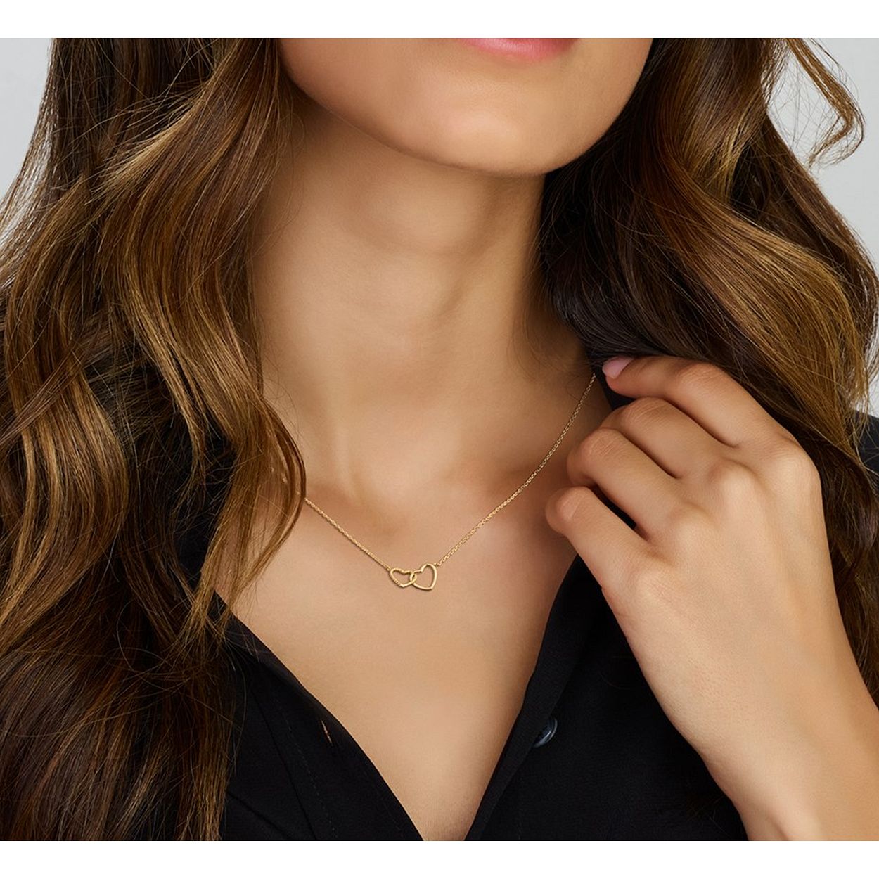 14 Karaat geelgouden collier uitgevoerd met twee hartjes. Het collier heeft draaglengtes van 40, 42 en 44cm. De hartjes hebben beide een afmeting van 7x8mm. Draag het collier met de bijpassende armband.