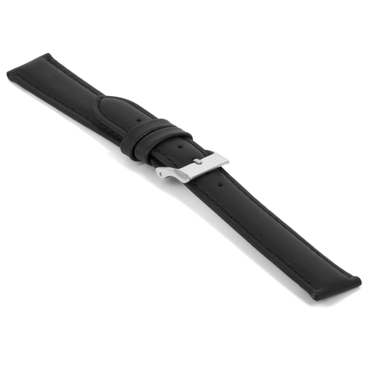 Zwart lederen horlogeband licht gevuld met zilverkleurig edelstalen gesp.