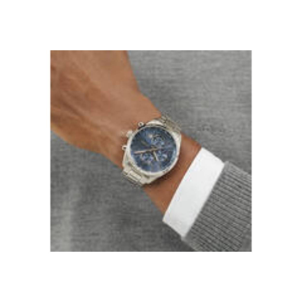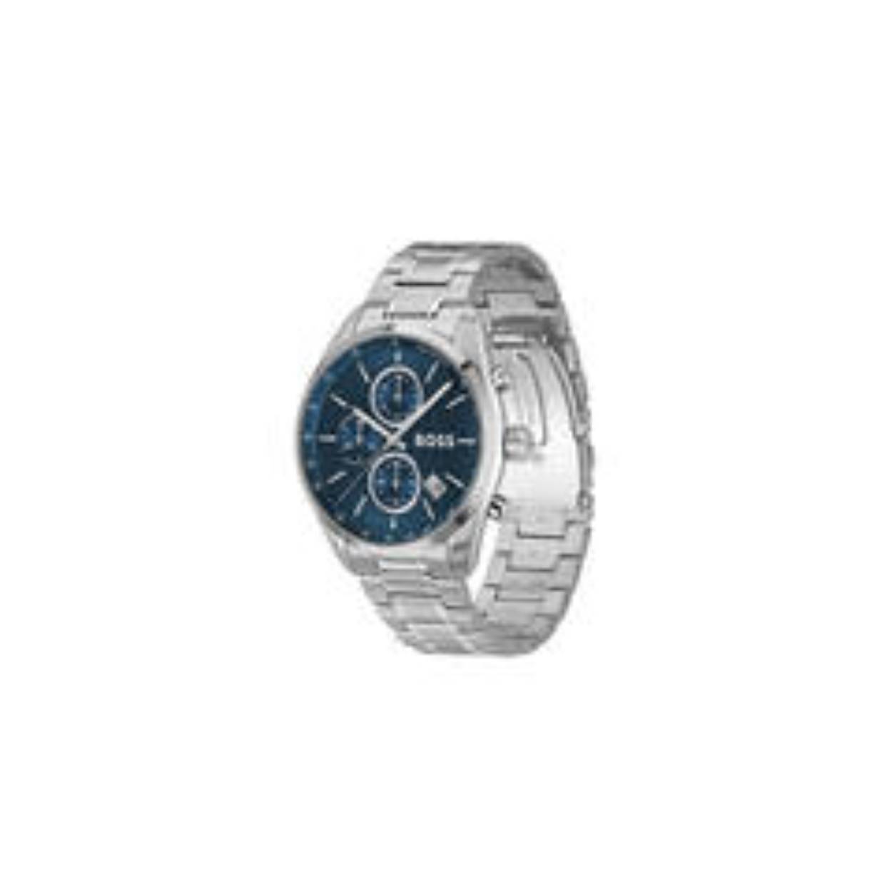 Boss stalen horloge Grand Prix. In de horlogekast van 44mm ligt een mooie blauwe wijzerplaat. Dit Boss horloge is te dragen zowel sportief en netjes.