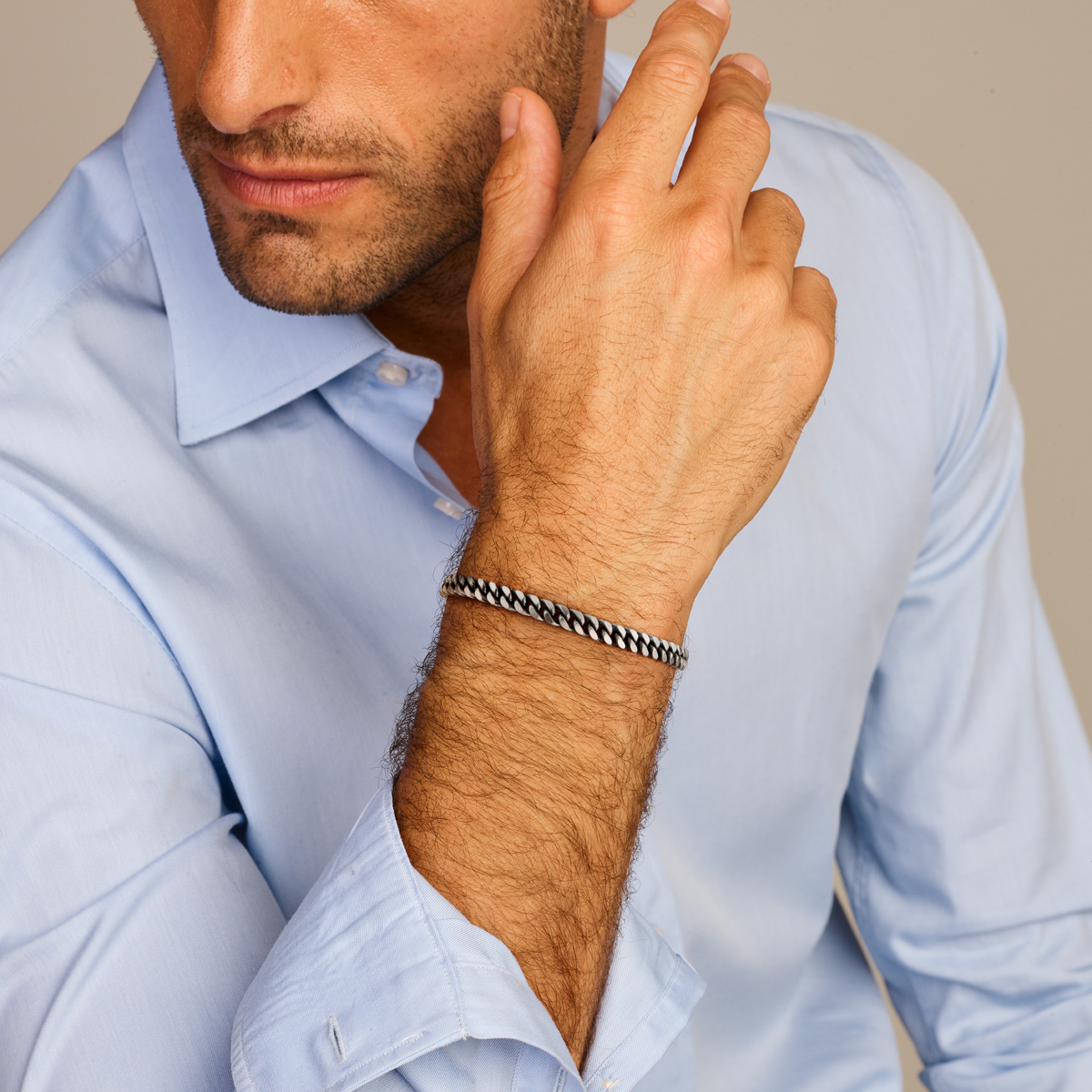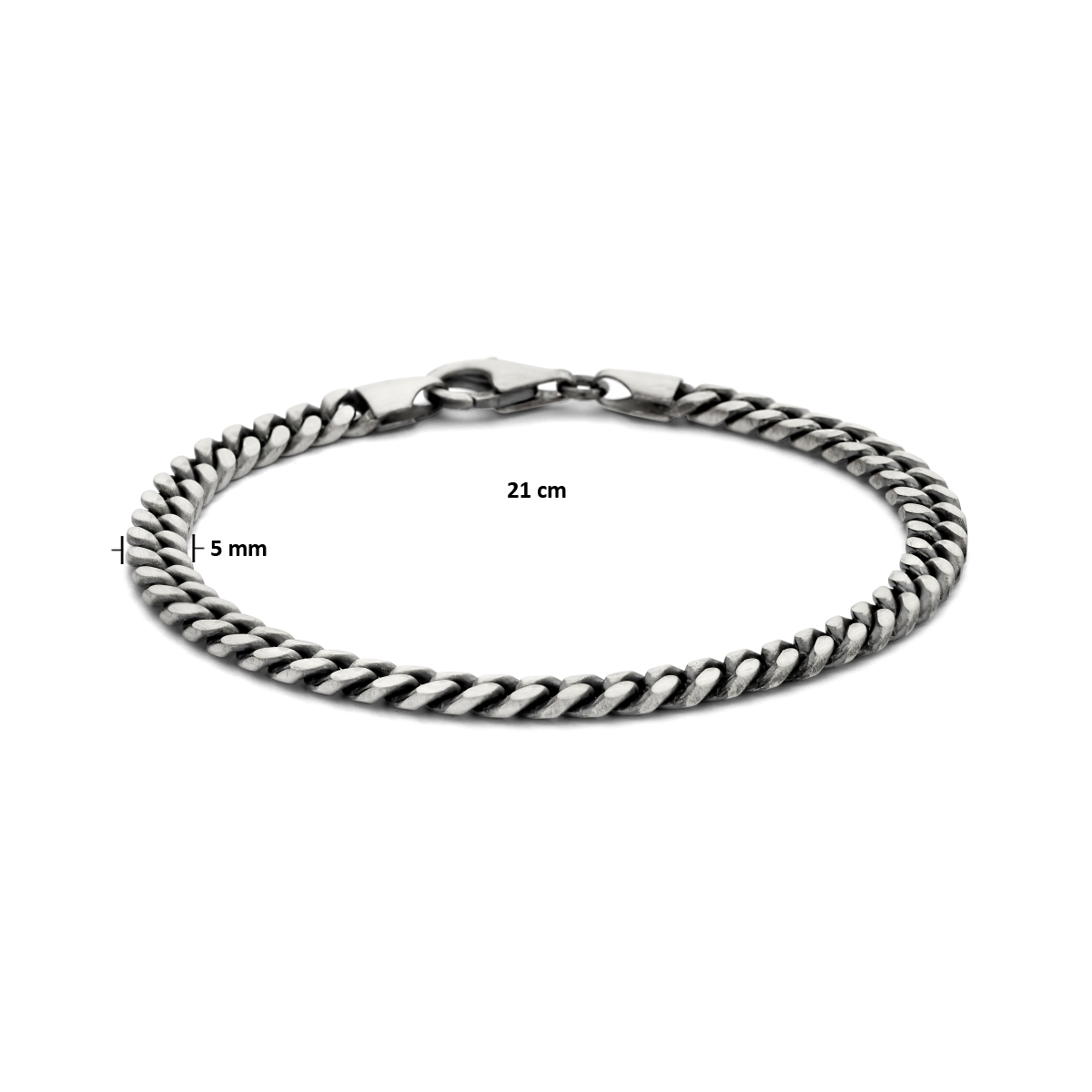 Geoxideerd 925 zilveren lengte artikel met een schakelbreedte van 5mm. Uitgevoerd met een karabijn sluiting.