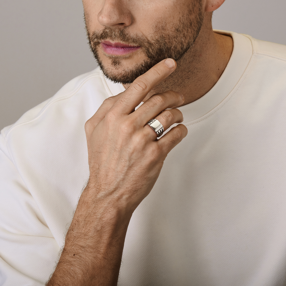 Geoxideerd 925 zilveren graveerring. De ring heeft een afmeting van 13x11.5mm.