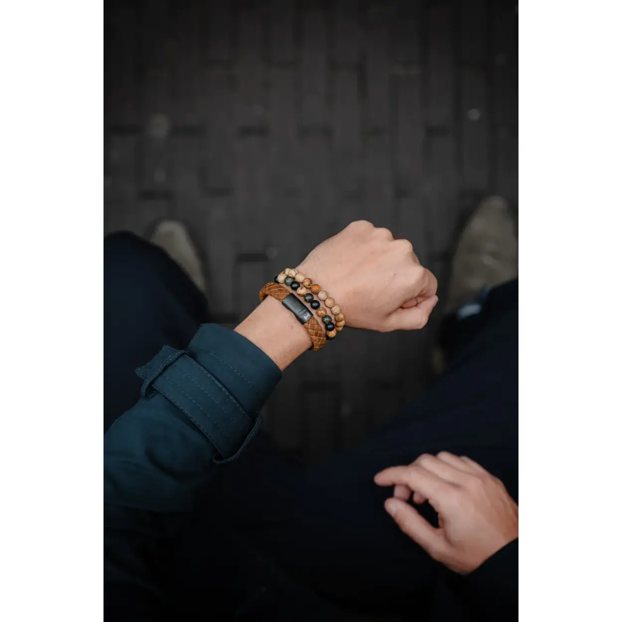 Stijlvol en tijdloos. Dat is waar deze armband voor staat. Deze armband past perfect bij iedereen en voegt direct stijl toe aan je persoonlijkheid. Gemaakt van hoogwaardig lichtbruin leer met een stalen geborsteld zwart slot. Deze armband is perfect te combineren met andere Aze sieraden.