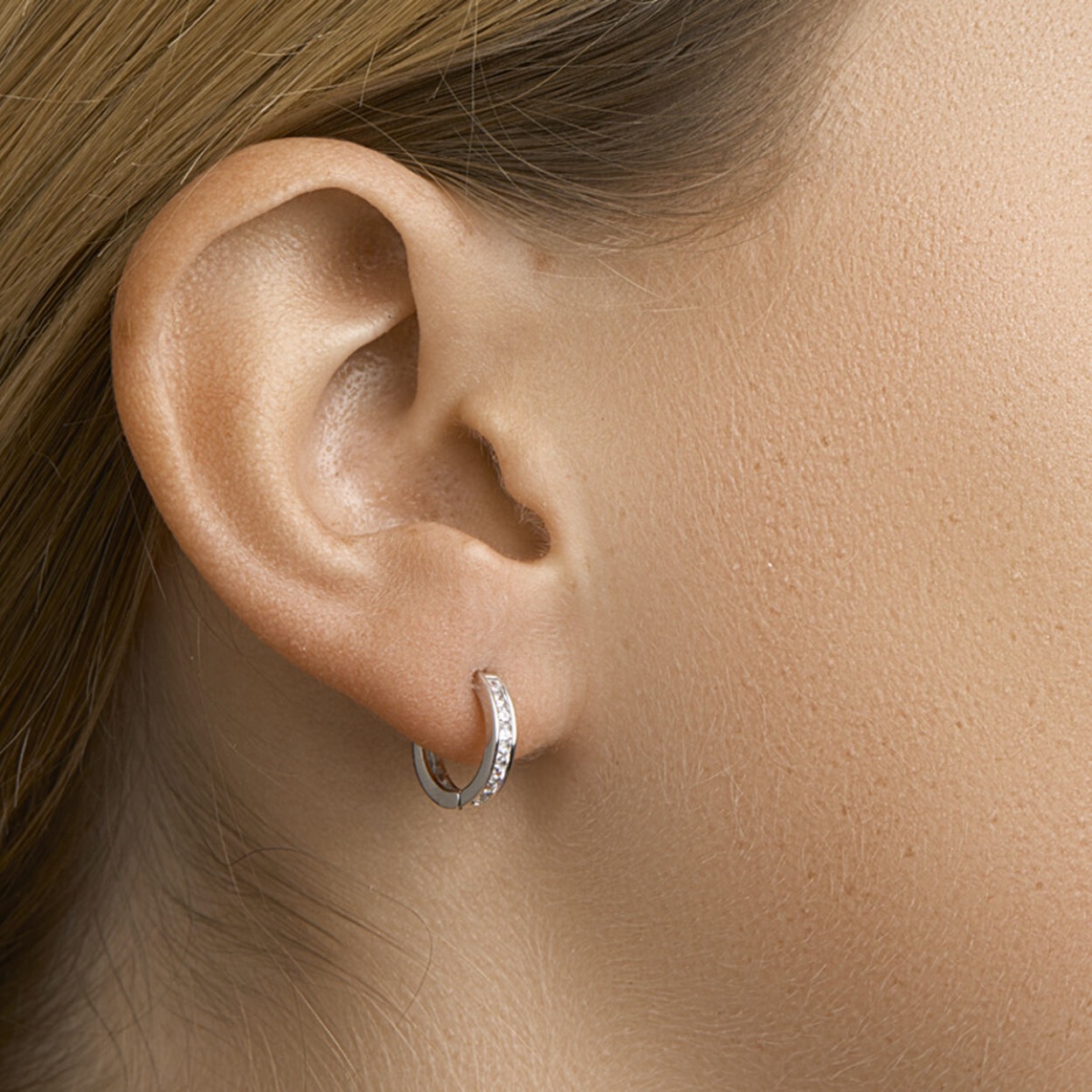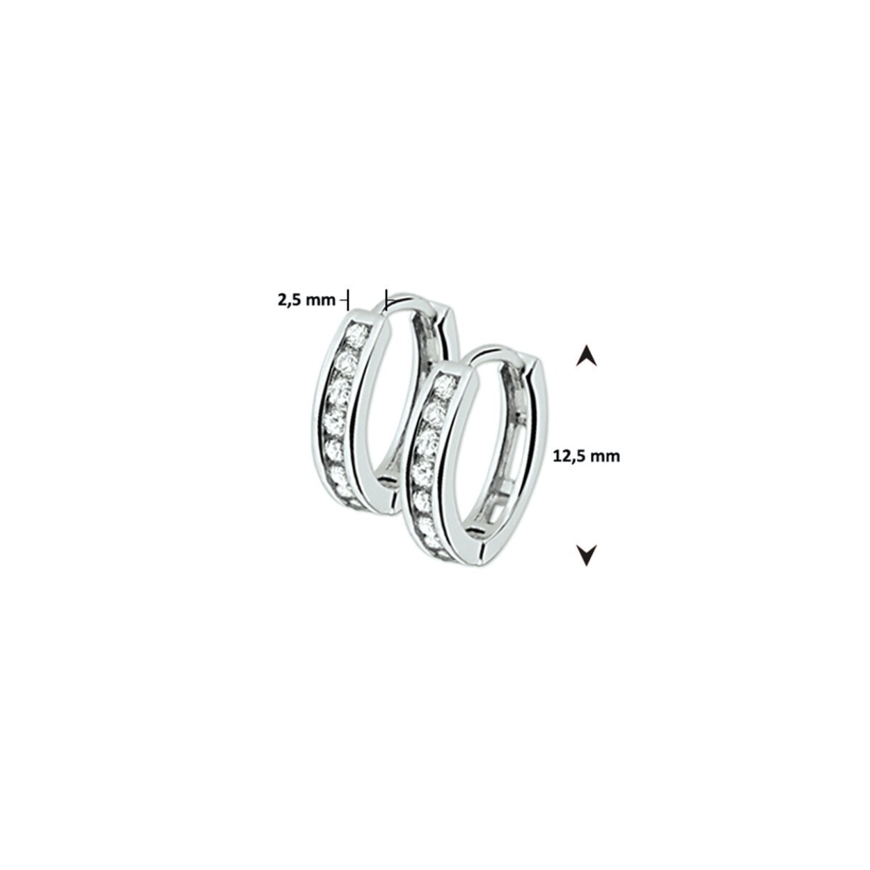 Gerhodineerd zilveren klapoorringen met  zirkoina. De oorringen hebben een diameter van  12,5  millimeter en een breedte van 2,5 millimeter.