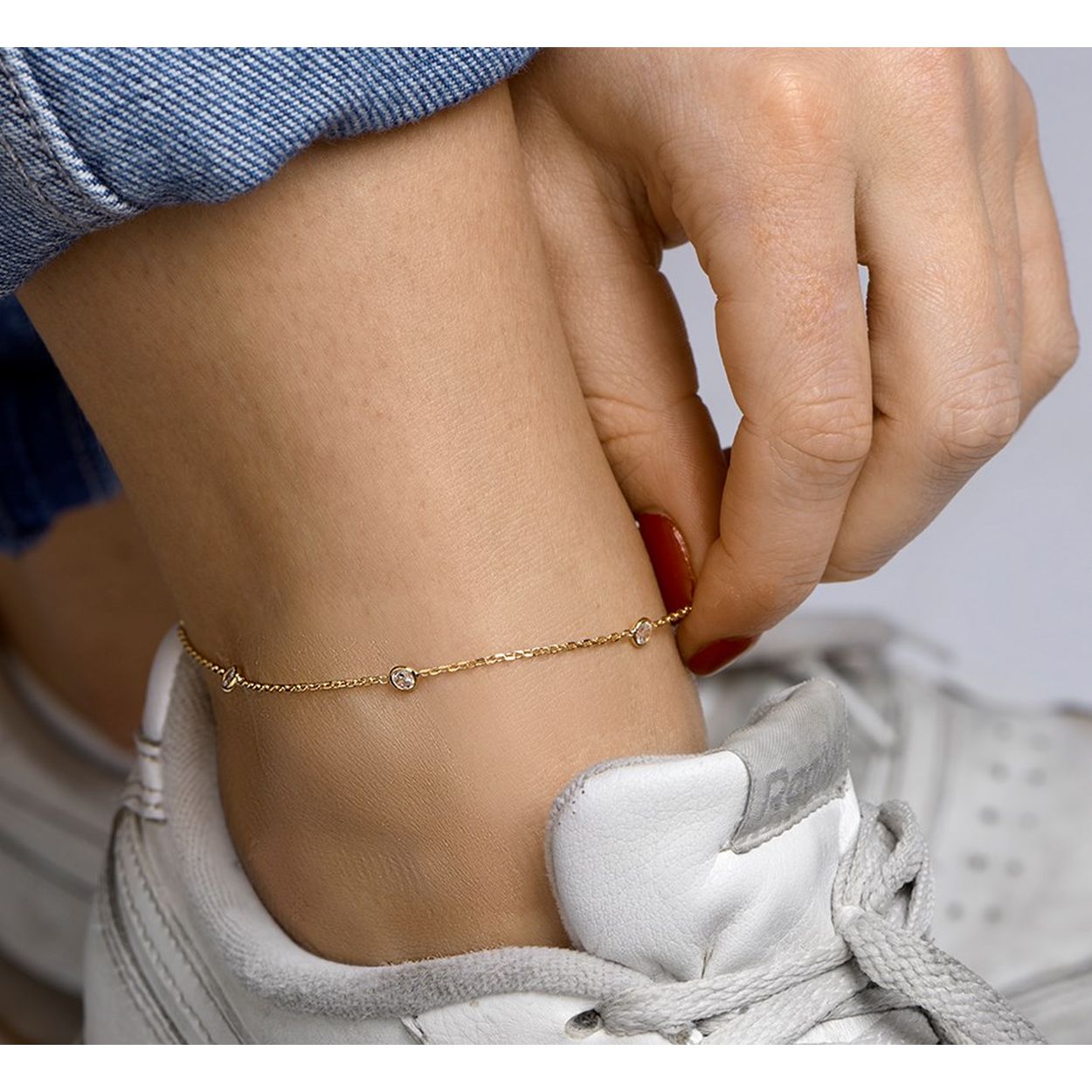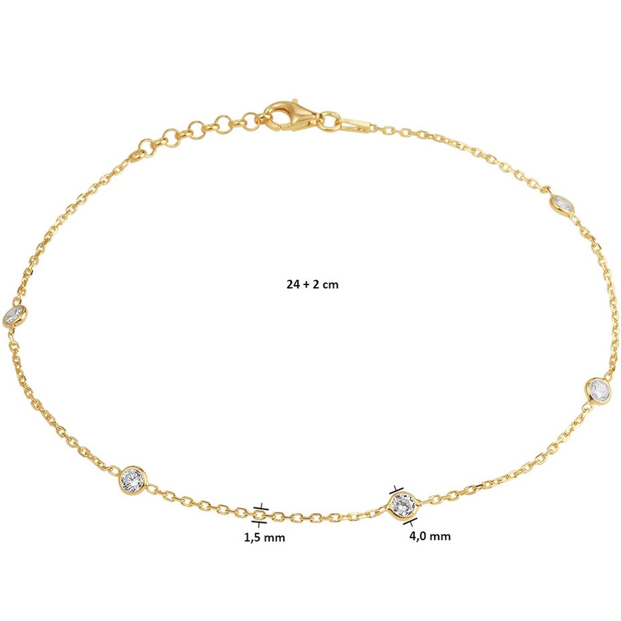 Geelgoud op 925 zilveren enkelbandje uitgevoerd met een schitterende zirkonia rij. Het enkelbandje heeft een draaglengte van 24cm met een extensie van 2cm en een breedte van 4mm. Het enkelbandje is uitgevoerd met een stevige karabijn sluiting.