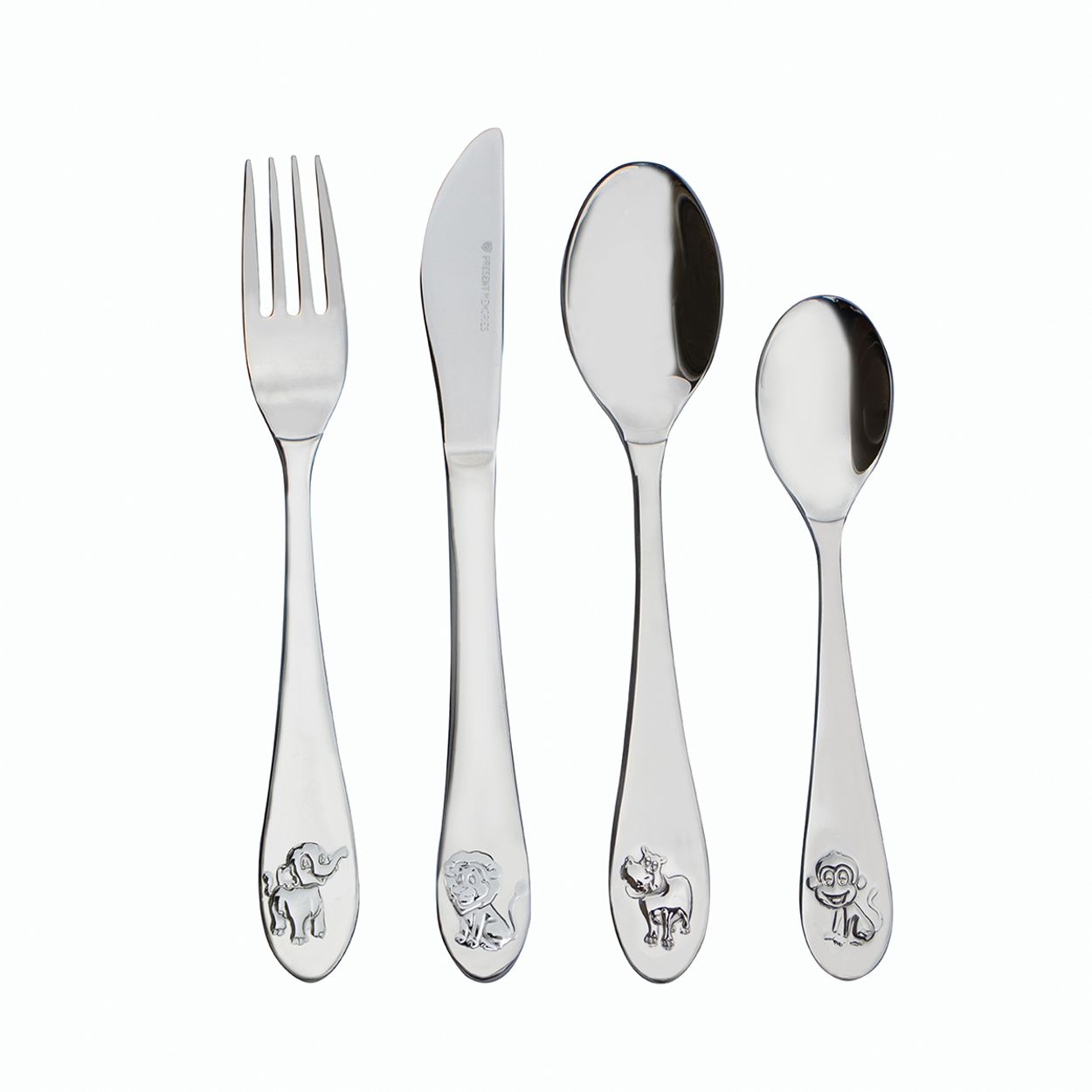 Dit 4-delige bestekset heeft het thema safari.  Op de bestekonderdelen staan dan ook de olifant, aap, nijlpaard en leeuw. Omdat het bestek is vervaardigd uit 18/10 RVS kan het in de vaatwasser. De bestekonderdelen kunnen worden gegraveerd. Leuk als geboorte-, doop- of verjaardagscadeau. U kunt één naam gratis laten graveren. De vork en de lepels zullen aan de achterzijde gegraveerd worden. De gravure kunt u vermelden in het opmerkingenveld tijdens het bestelproces. Gegraveerde artikelen kunnen niet worden geruild. Afmeting: vork: 172mm, mes: 190mm, eetlepel: 170mm, dessertlepel: 140mm.