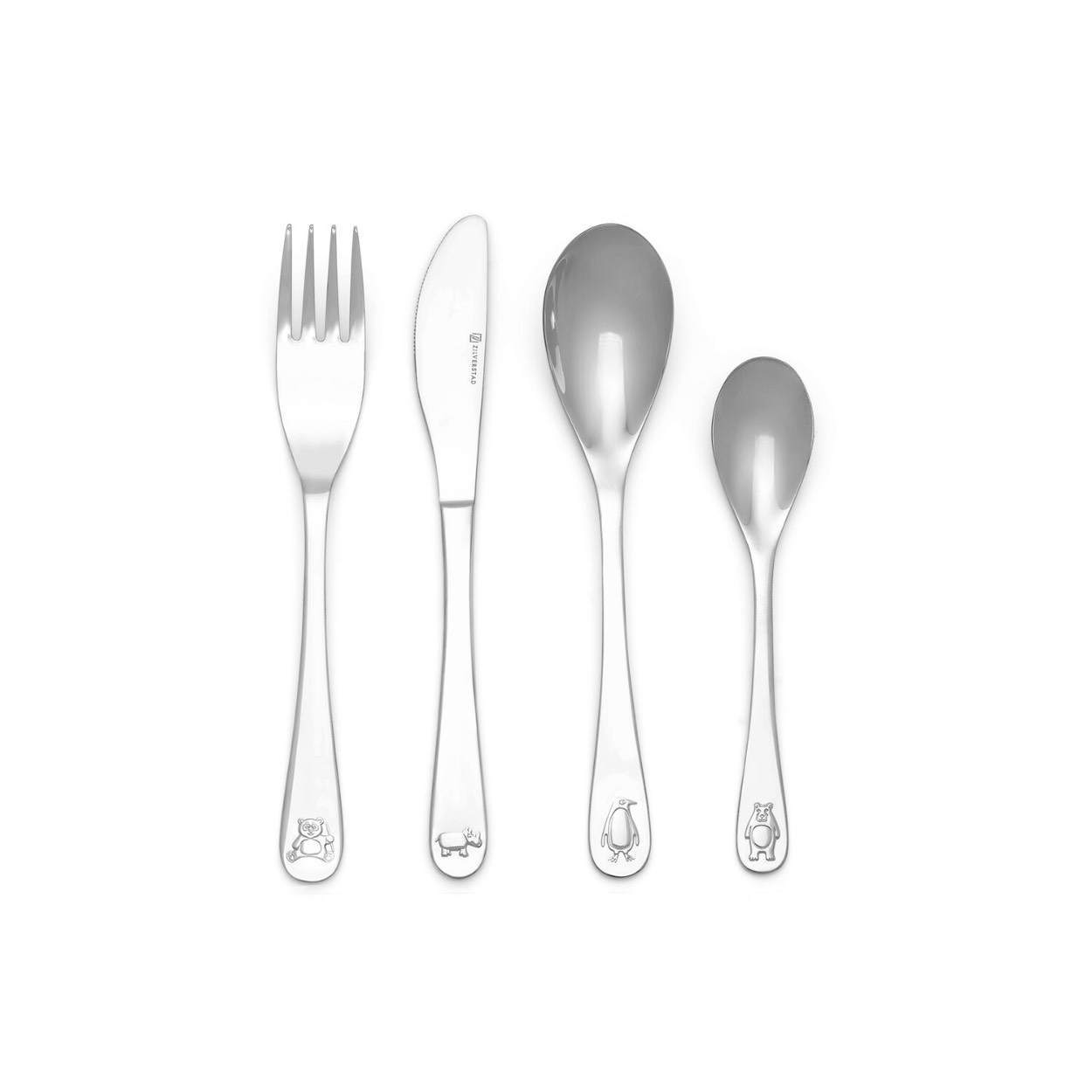 Eten wordt nóg leuker met dit 4-delige kinderbestek met als thema Wildlife. Op de bestekdelen zijn een panda, neushoorn, ijsbeer en pinguïn  afgebeeld.  De eerste hapjes worden nóg leuker! Het bestek bestaat uit een mes, vork, lepel en paplepeltje, is gemaakt van hoogwaardig 18/10 roestvrij staal. Het kan gereinigd worden in de vaatwasser. Wel zo handig! De kleurrijke verpakking maakt het bestek uitermate geschikt om te cadeau te geven.