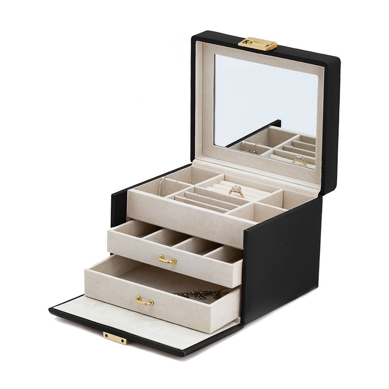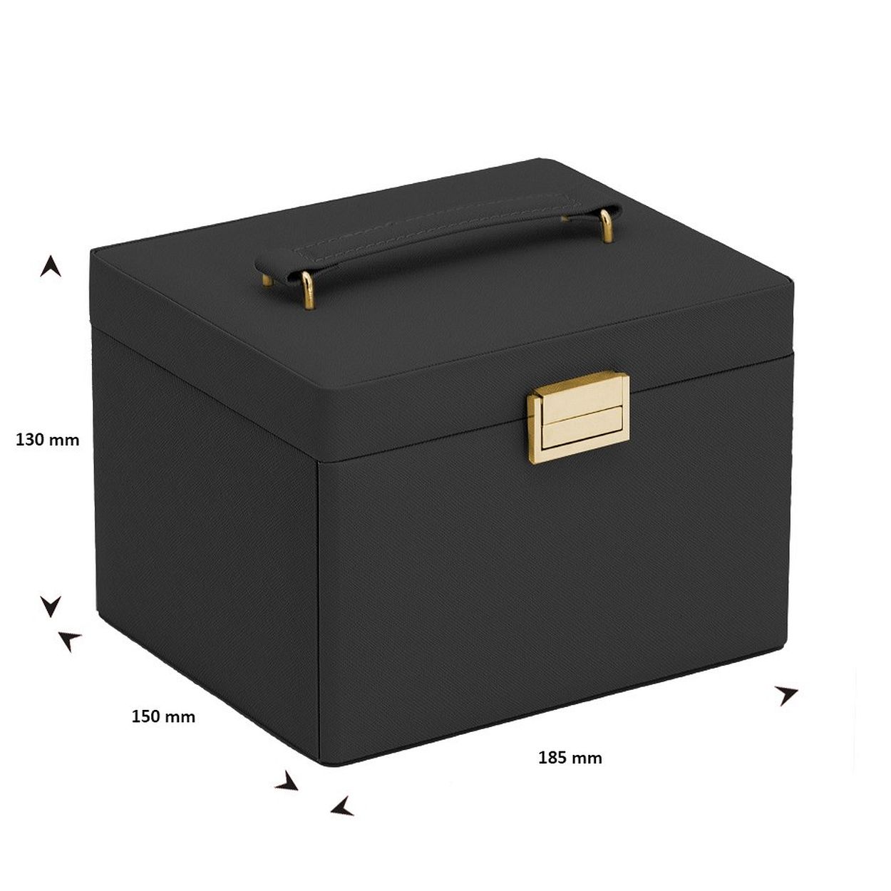 Luxe sieradenbox in de kleur zwart uitgevoerd met stevige scharnieren, magnetische sluiting, goudkleurige elementen en een klein spiegeltje. De doos heeft 2 lades en vakjes in verschillende groottes. Een compacte box om verschillende sieraden in op te bergen.