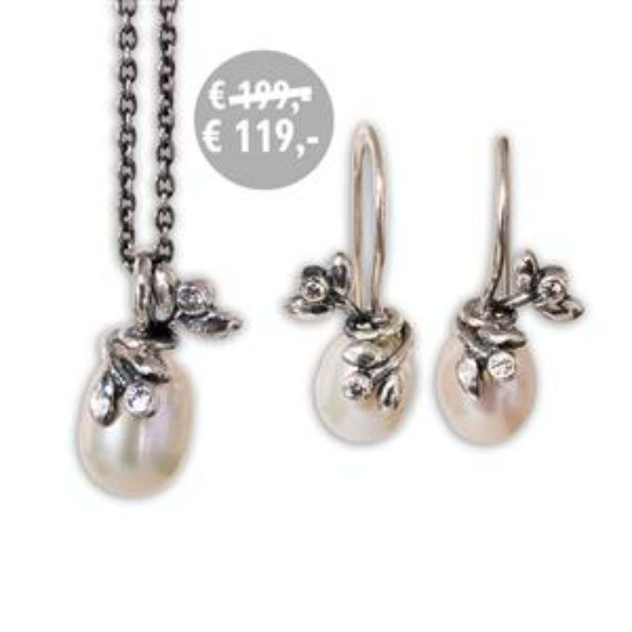 For someone special! Een sterling zilveren ketting (45cm) en oorhangers met witte parel en zilveren bloemetjes met zirkonia’s.