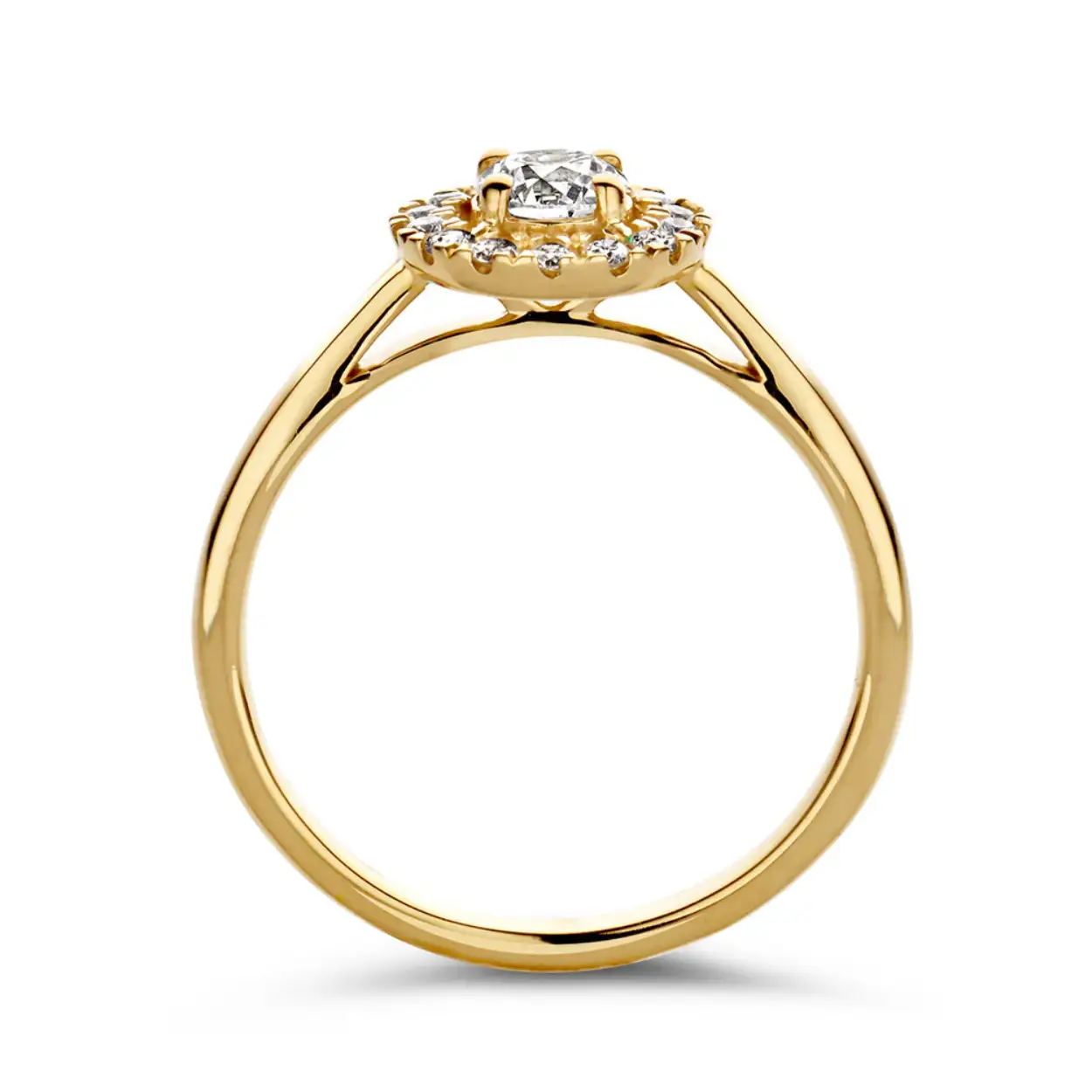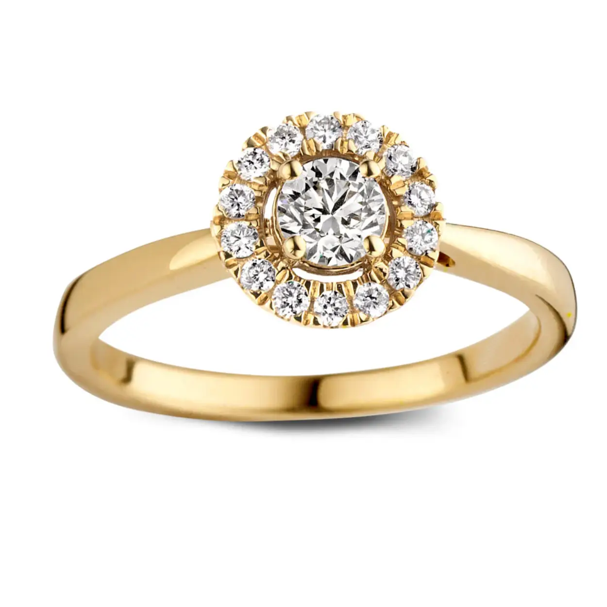 My Style Diamonds 14krt geelgouden ring met diamant 0.22crt HSI. Dankzij haar stijlvolle en luxe uitstraling is deze geelgouden ring één van onze meest populaire ring modellen. De ring heeft een schitterende entourage zetting. De ronde middensteen (briljant geslepen) wordt hierbij omringd door kleinere briljanten.  De ring heeft een sierlijke verhoogde zetting, waardoor hij perfect gecombineerd kan worden met een gladde of diamanten rijring. Combineer deze entourage ring met  andere sieraden uit uw collectie