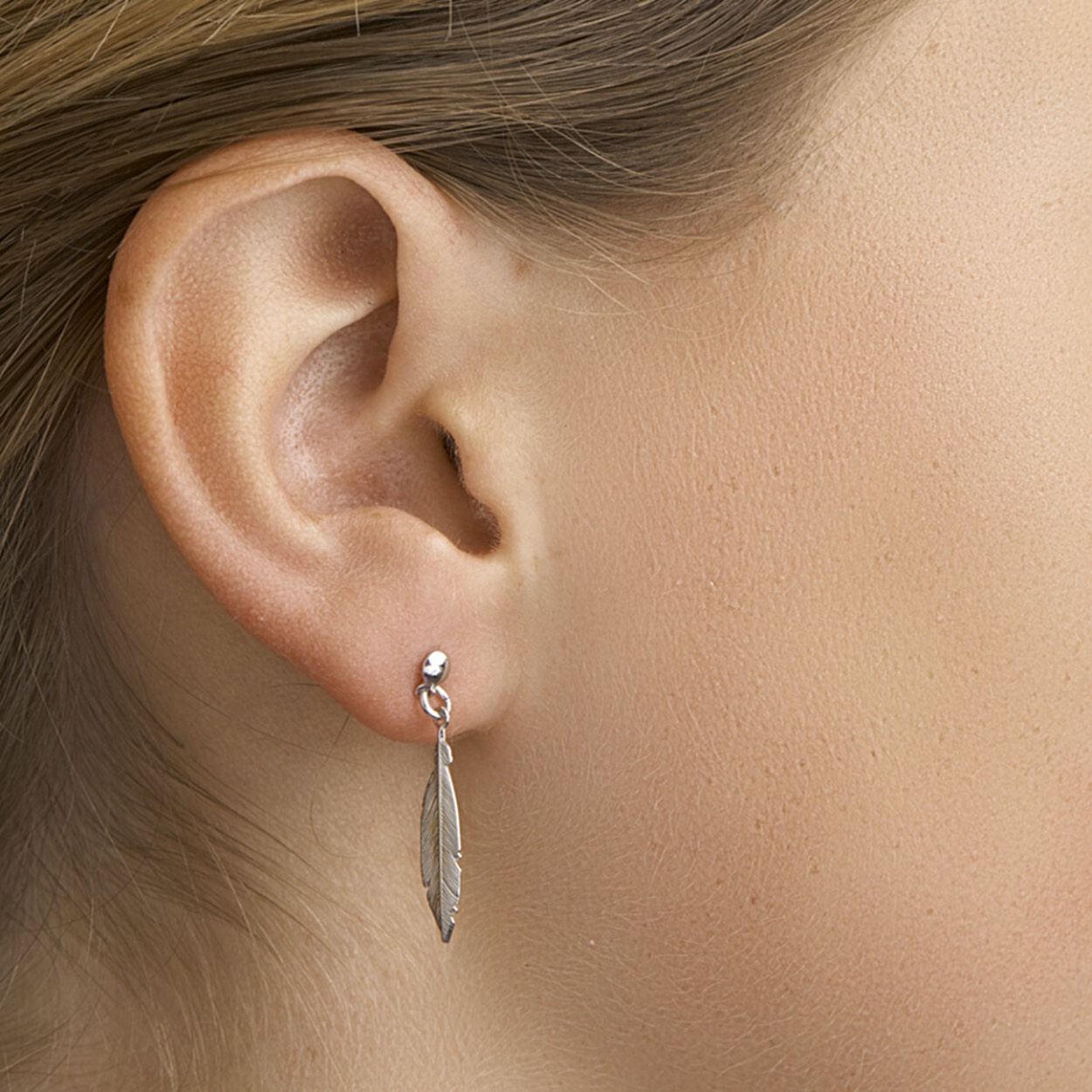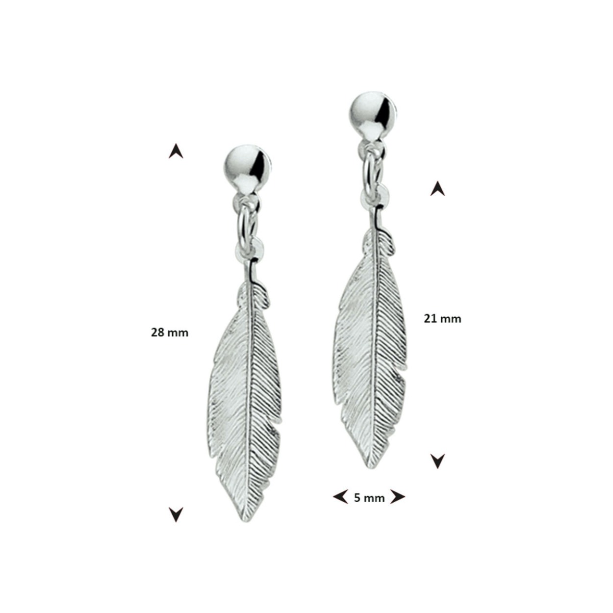 Gerhodineerd 925 zilveren oorhangers uitgevoerd met een veertje. De oorhangers hebben een totale hoogte van 2.8cm. De veer heeft een afmeting van 21x5mm.