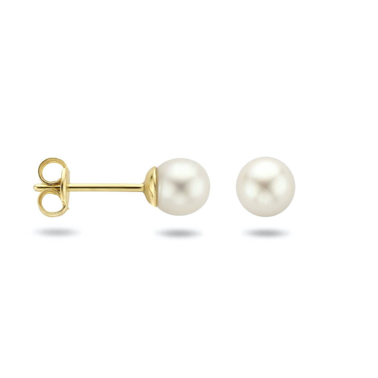 14 Karaat geelgouden oorknoppen met een zoetwaterparel.  De parel heeft een diamameter van 5,5mm.