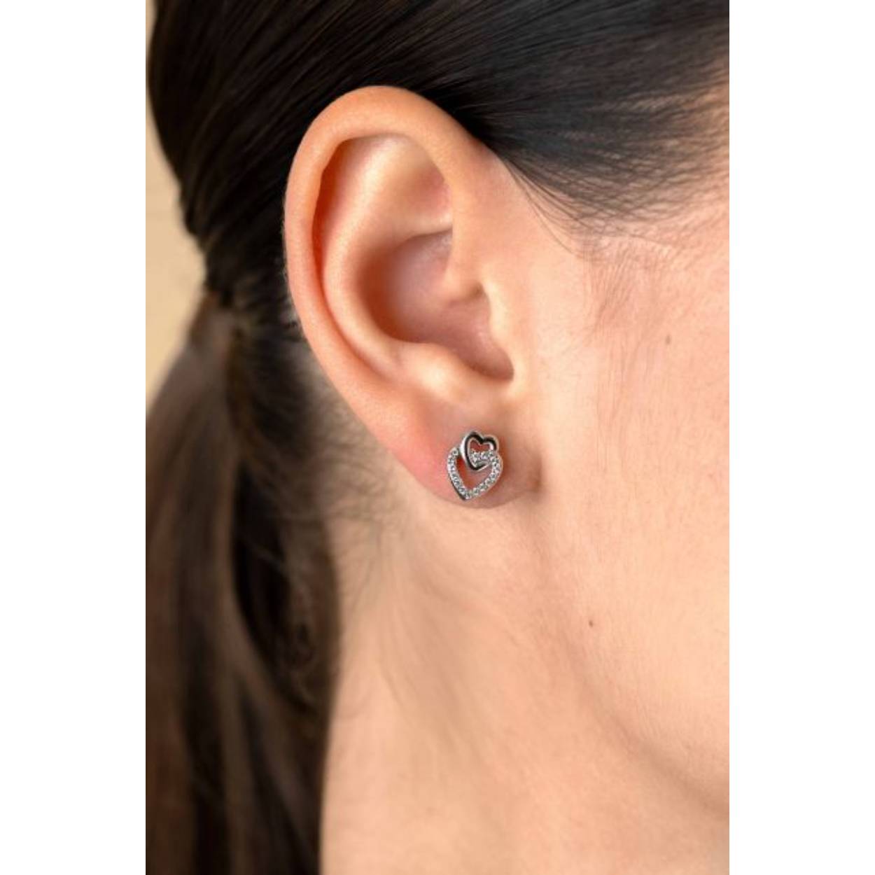 ZINZI zilveren oorknoppen 10mm, waarbij twee open harten mooi met elkaar verbonden zijn: een glad open hartje en een groter open hartje bezet met witte zirconia's. Vervaardigd van eerste gehalte zilver (925) en met extra rodiumlaag voor een langdurige glans.