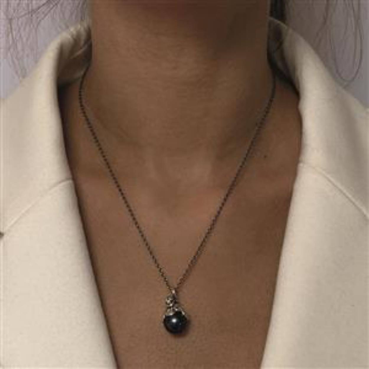 Deze Sterling zilveren ketting heeft een mooie hanger en bevat een peacock parel van 10-10½ mm. De ketting kan op 42 en 45 cm gedragen worden.