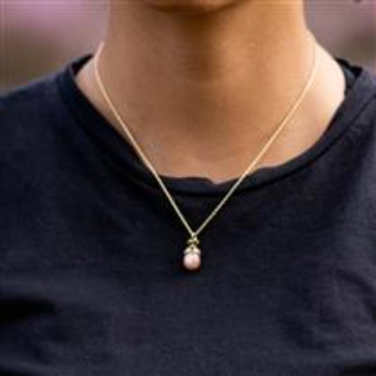 Deze Rabinovich  geel goud vergulde ketting kan zowel op 42 en 45 cm. Aan de ketting hangt een hanger met een 11 x 9 mm perzik maansteen.