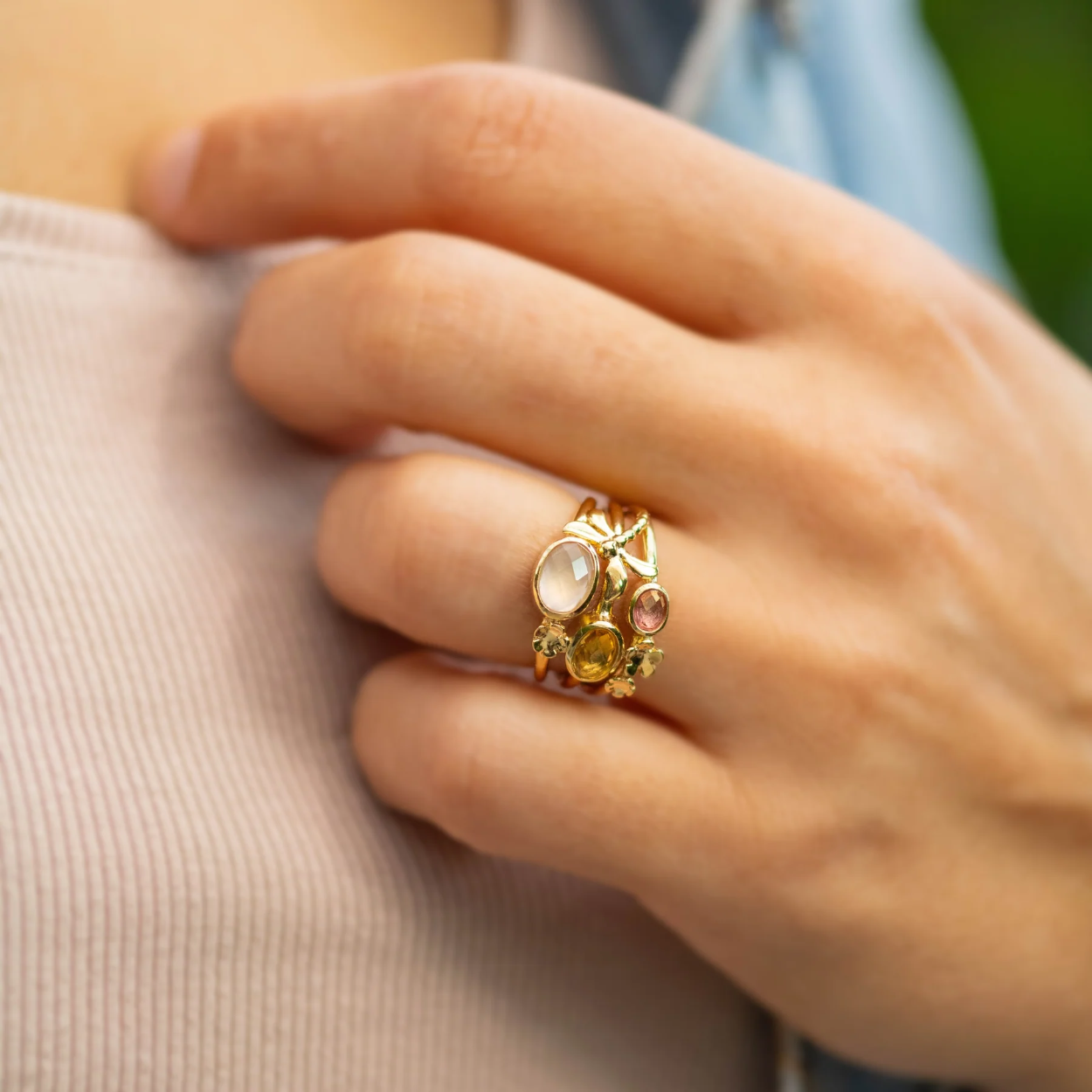 Rabinovich zilveren ring Dragonfly. Deze geel goud vergulde ring bevat een mooie 7 x 5 mm rozenkwarts checker facetgeslepen, een 6 x 4 mm citrien checker facetgeslepen en een 4 x 3 mm roze topaas checker facetgeslepen.