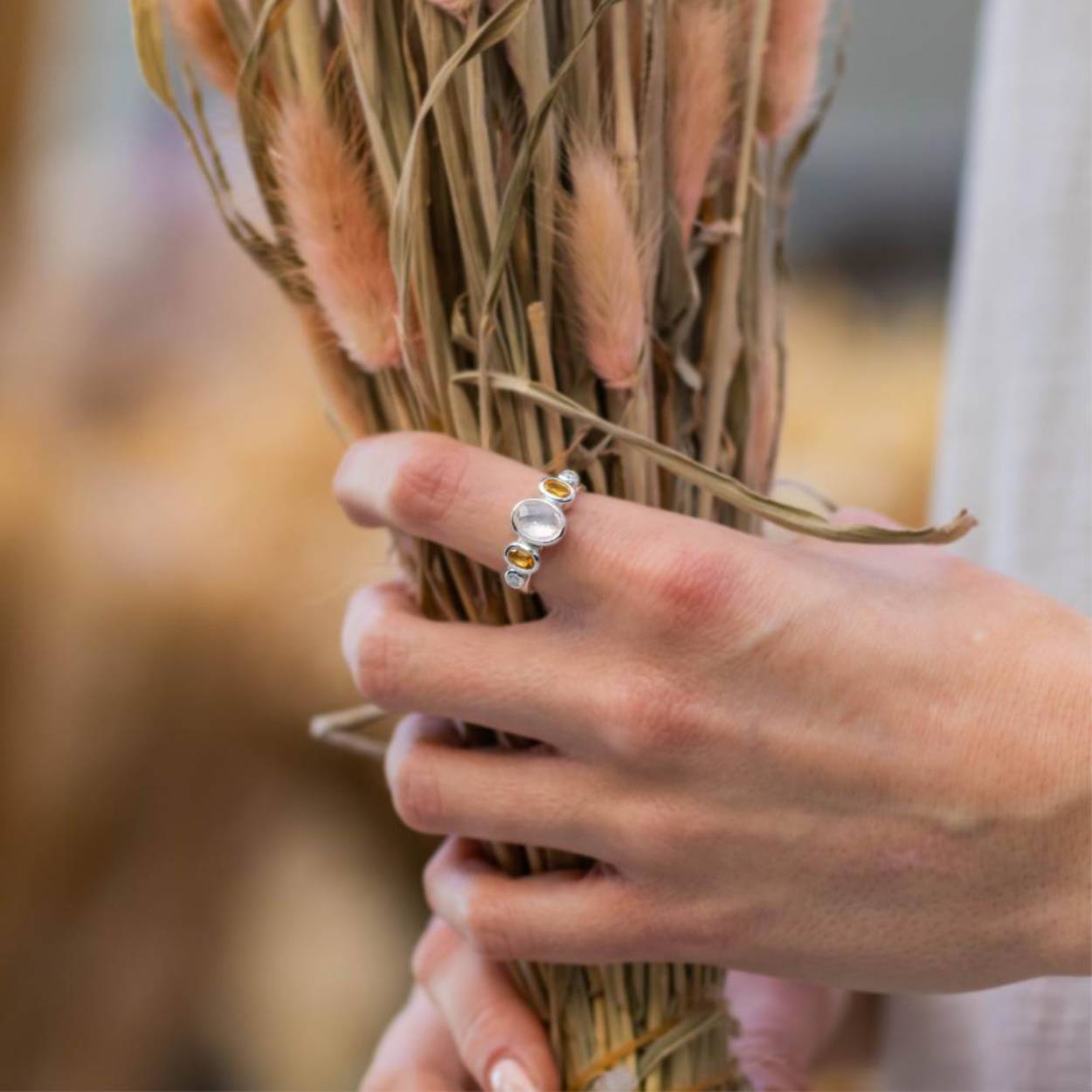 Deze sterling zilveren ring heeft in het midden een 8 x 6 mm rozenkwarts en aan beide kanten een 5 x 3 mm citrien en een 2,5 mm zirkonia.