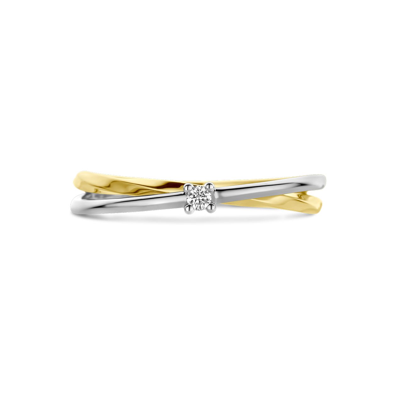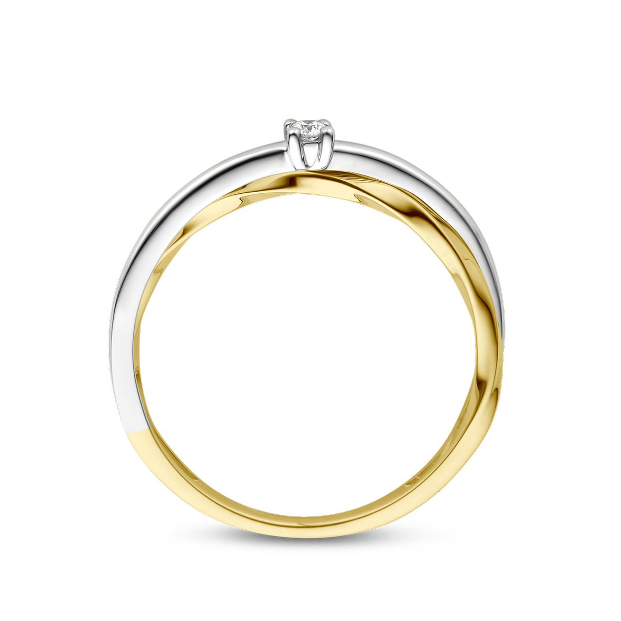 14 Karaat bicolor geel- en witgouden ring uitgevoerd met een 0.03crt H Si2 diamant. De ring heeft een breedte van 3mm.