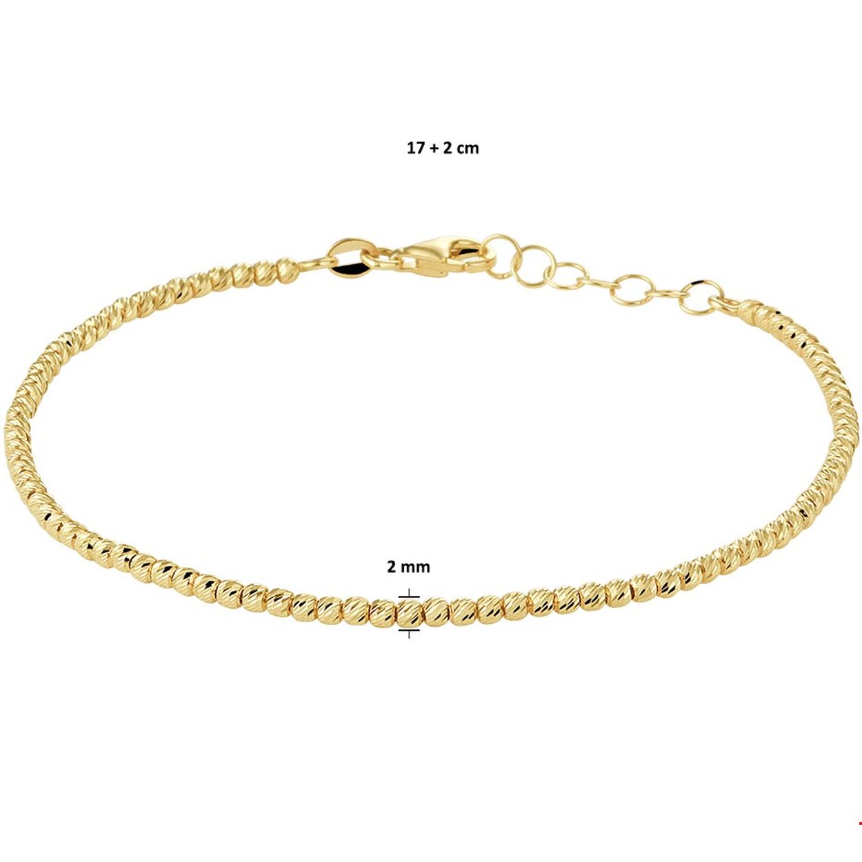 Fijn geelgouden armband met een draaglengte van 17cm en een extensie van 2cm. De armband heeft gediamanteerde bolletjes met een diameter van 2mm en is uitgevoerd met een stevige karabijn sluiting. Goed te combineren met bijpassende sieraden uit onze collectie.